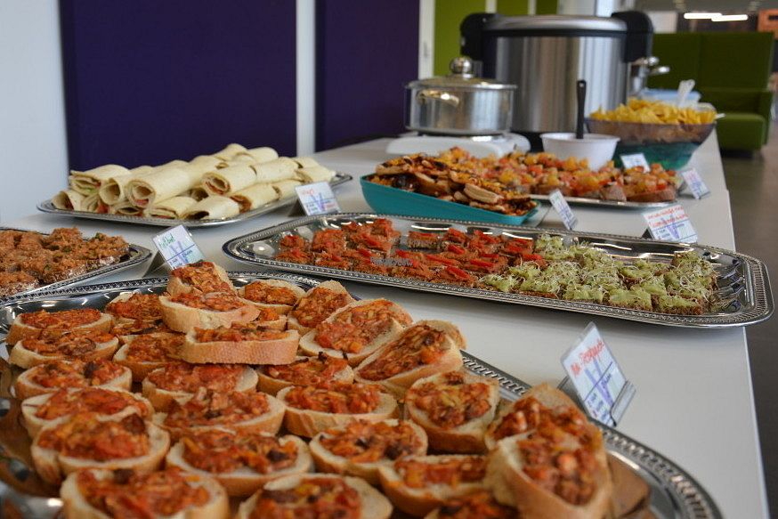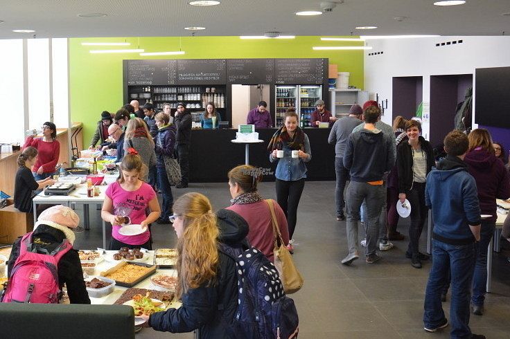 The vegan brunch on the first Saturday of the month is organized by a local animal rights group in the Glaskasten. There are always many sweet and savoury options available on the buffet, which looks quite professional. During the brunch, plant based milk only is available. Usually there is a lecture about animal right issues or other emancipatory topics.