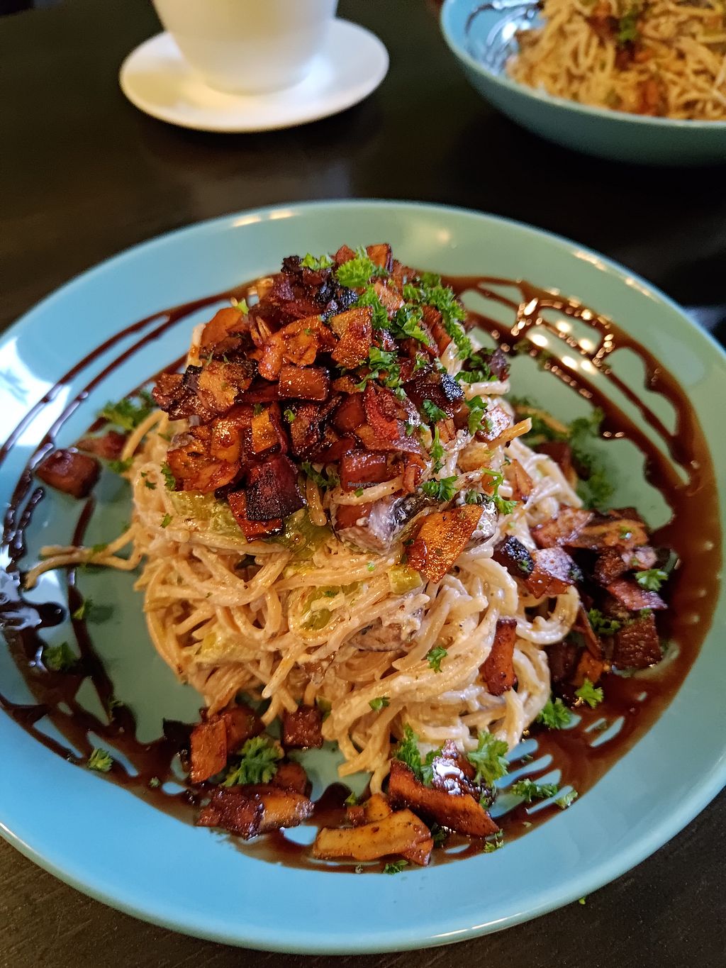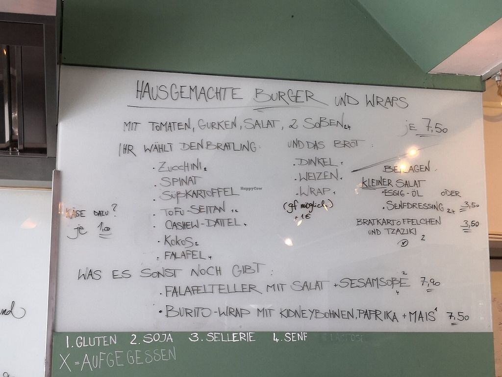 Scheinbar gab es früher auch Burger und Gyros. Inzwischen aber nur das wöchentlich wechselnde Mittagsmenü sowie eine große Auswahl an Kuchen und Gebäck. Das Essen war sehr lecker, frisch und man muss sich keine Sorgen machen, dass etwas nicht vegan ist.