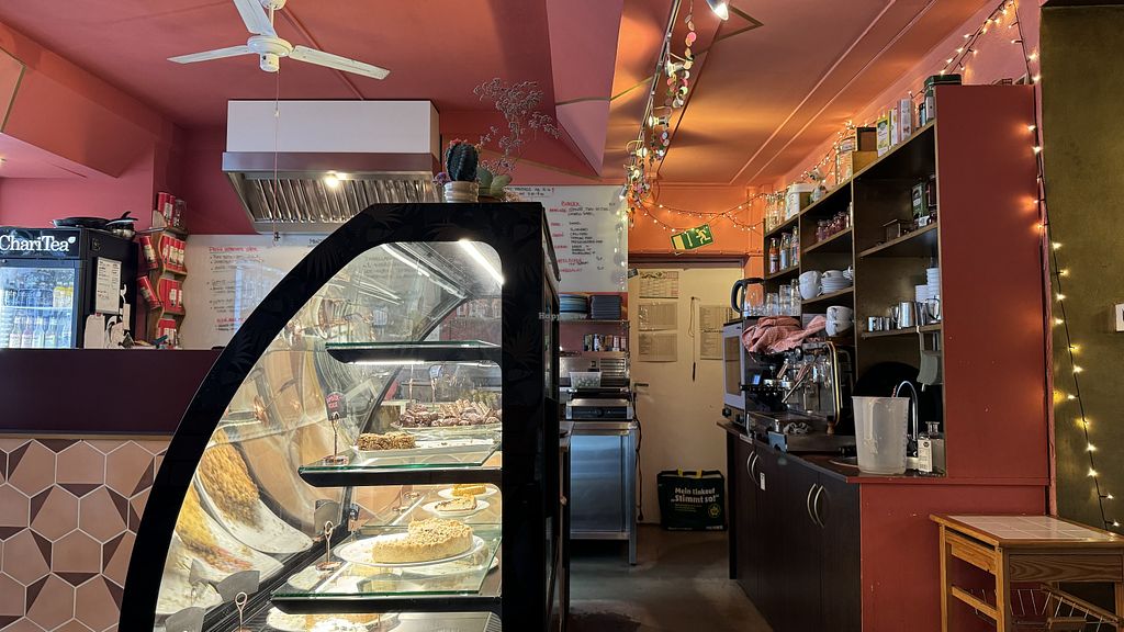 Das Café ist komplett vegan, es gibt leckere gesunde Gerichte, Kaffee und eine große Kuchenauswahl, sehr unterstützenswert.