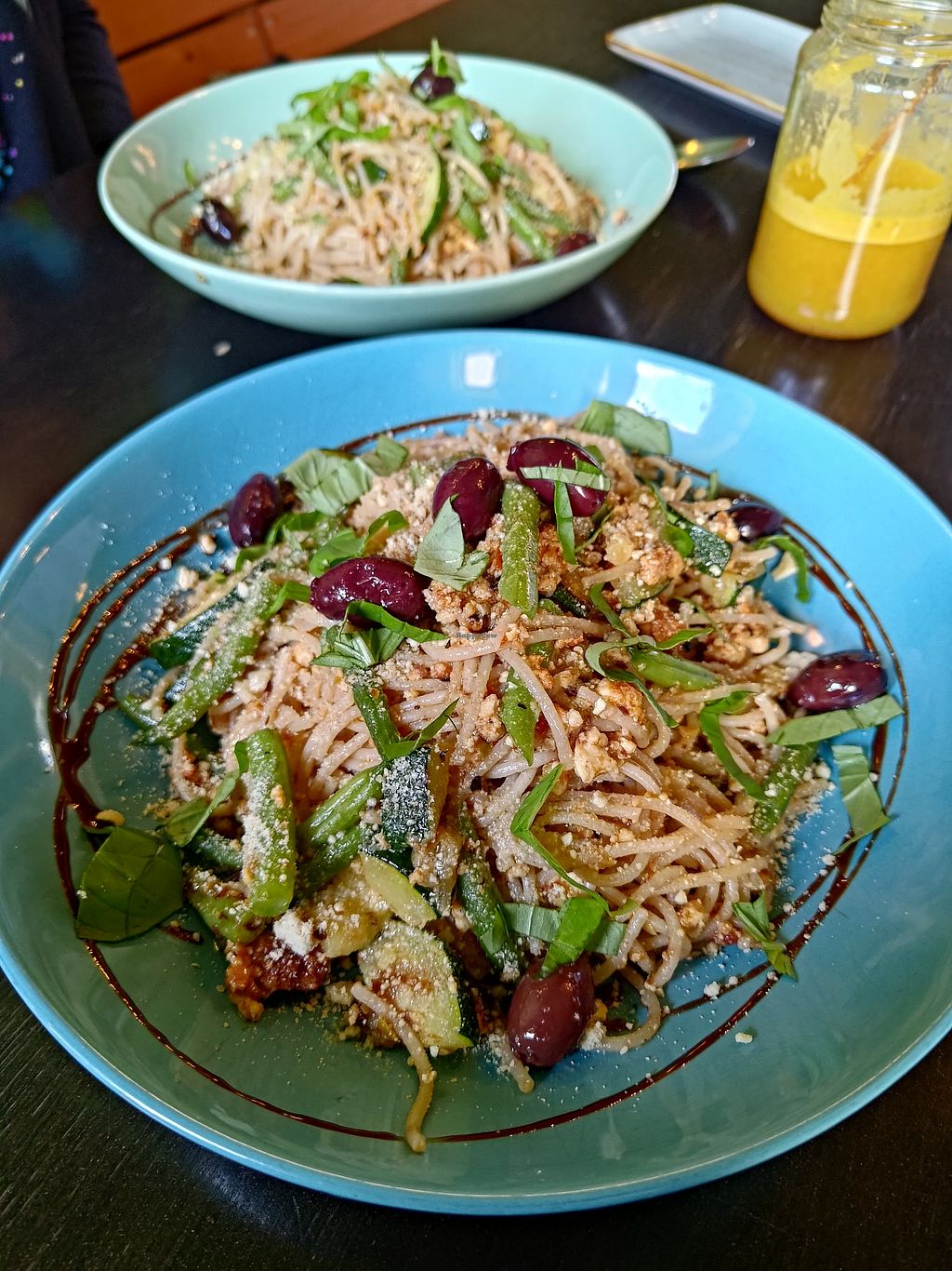 Bei den Hauptspeisen hatten wir zweimal den Mittagstisch mit Nudeln, die Portion war okay, der Preis für einen Mittagstisch hoch, für ein normales Essen okay. Der Burger wurde mit Weizenbrötchen bestellt, dass eher für ein Sandwich geeignet wäre und den Burger schwieriger essbar machte. Zusätzlich war das Seitan-Tofu-Patty leider nicht lecker und mit komischer Konsistenz.
