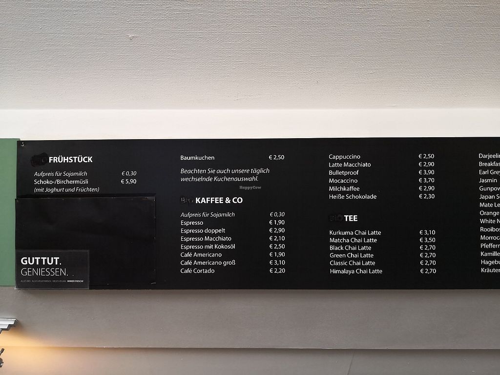 Read moreCafé vegano com várias opções de tortas e bolos veganos, inclusive sem glúten. É serviço almoço com algumas opções de pratos. Atendimento bom, as atendentes falavam bem inglês. Pedi o prato do dia (“kartoffel maronenpüree”) e achei a quantidade bem pequena para mim. Encomendei uma torta vegana sem glúten, notei que os alemães que comeram elogiaram bastante. Achei os preços de tudo um pouco salgados. Valeu a experiência no geral.