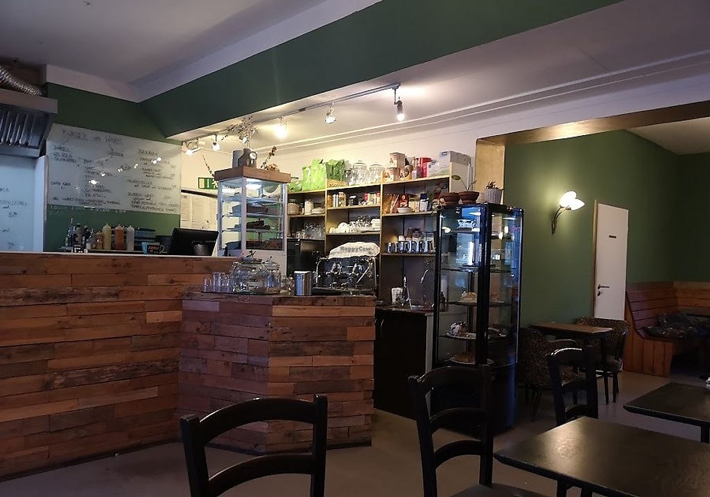 Ein kleines Café oder Restaurant mit genügend Sitzmöglichkeiten. Rein veganes Angebot. Leckeres Kürbis-Curry mit Reis, leckere Burger (zwei Patties von ca 5 Probiert). Die Kuchenecken haben auch geschmeckt.