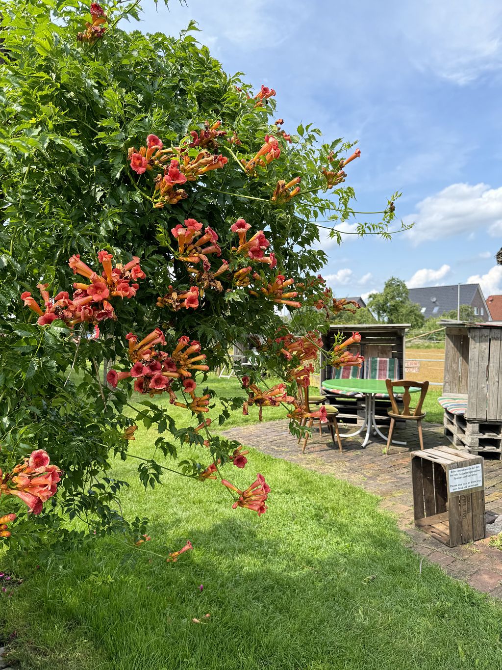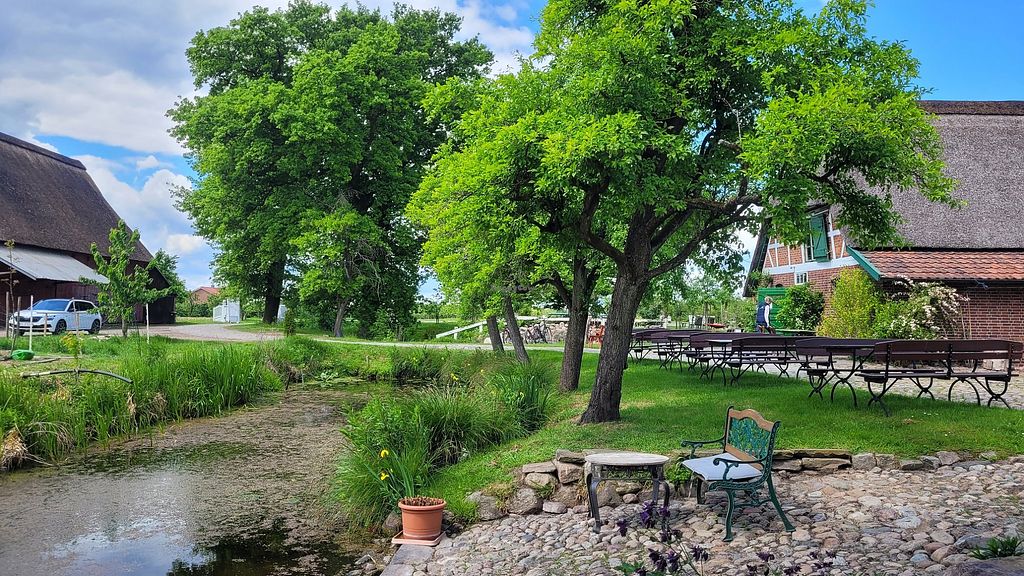 Very nice garden and orchards with free roaming chickens. The cafe is inside an old house with thatched roof. They offer multiple vegan seasonal fruit cakes, cocoa and hot chocolate. The cakes are very tasty.