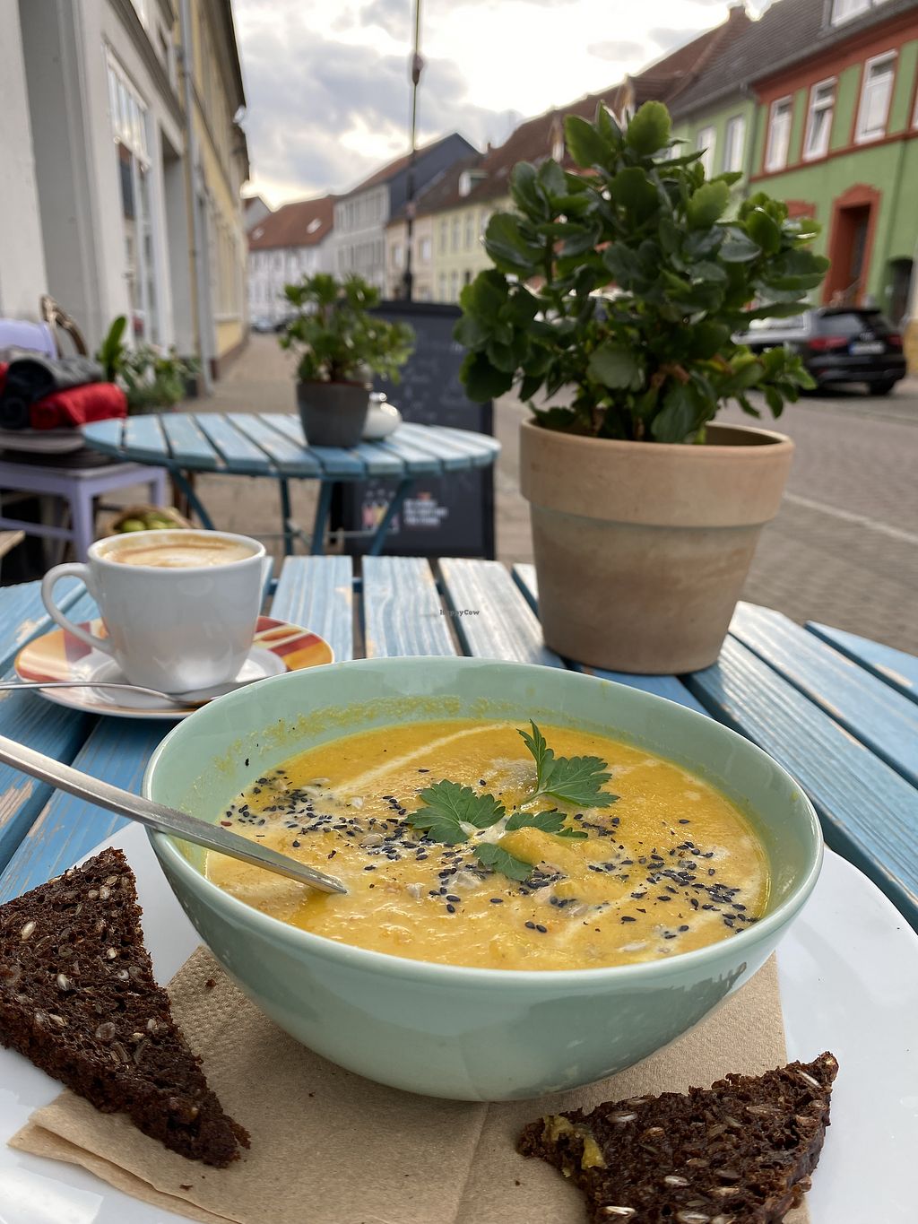 Wir sind durch HappyCow aufmerksam geworden und hatten sehr leckeren veganen Zitronenrührkuchen und eine Blumenkohl-Möhrensuppe mit Kokosmilch. Sehr nette Bedienung gabs auch und ein Plätzchen an der frischen Luft.