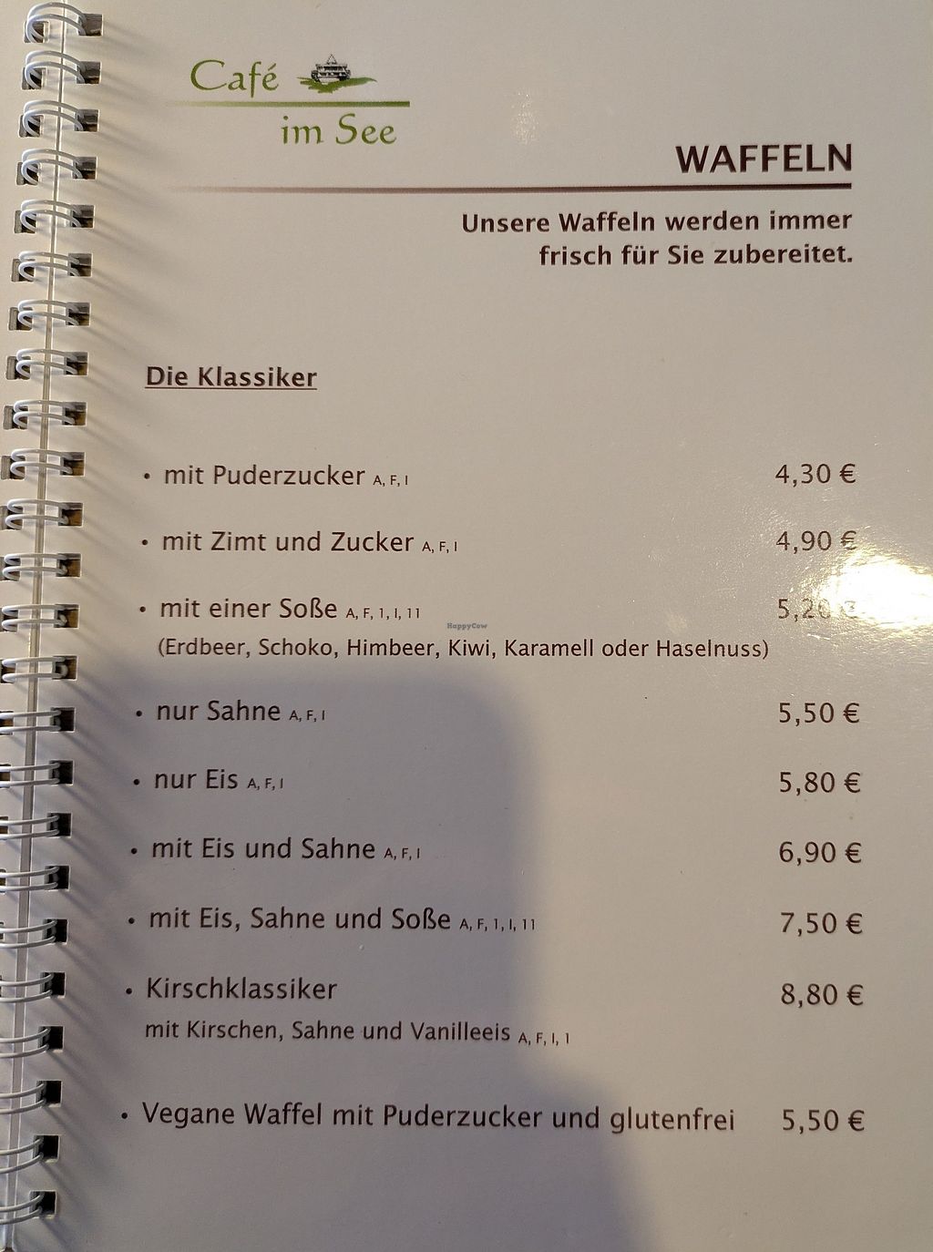 Es gibt vegane Eisbecher und vegane, glutenfreie Waffeln. Auch können alle Heißgetränke mit Hafermilch gegen Aufpreis zubereitet werden. Die vegane, glutenfrei Falafelwaffel ist zusätzlich zuckerfrei. Außerdem gibt es eine vegane Tagessuppe und veganen Apfel- oder Himbeerkuchen. In der Vitrine war auch ein veganer, glutenfreier Apfelkuchen angeführt, jedoch gab es diesen nicht als ich da war. Ich hatte die Falafelwaffel und sie war sehr lecker.
