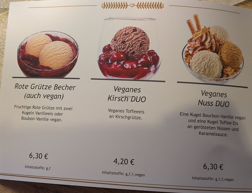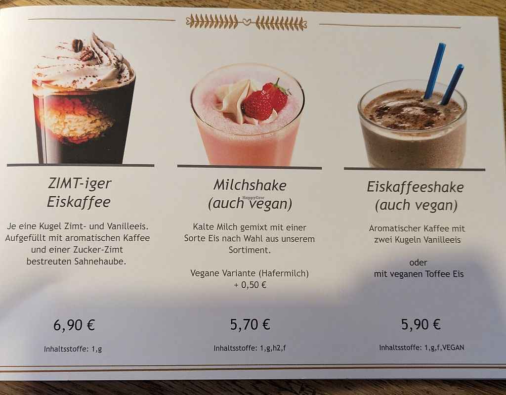 Es gibt Kaffee mit Hafermilch, Waffeln, Eis und Kuchen in einem schönen Ambiente. Sogar der Keks zum Kaffee war vegan. Das Personal ist sehr freundlich und aufmerksam.