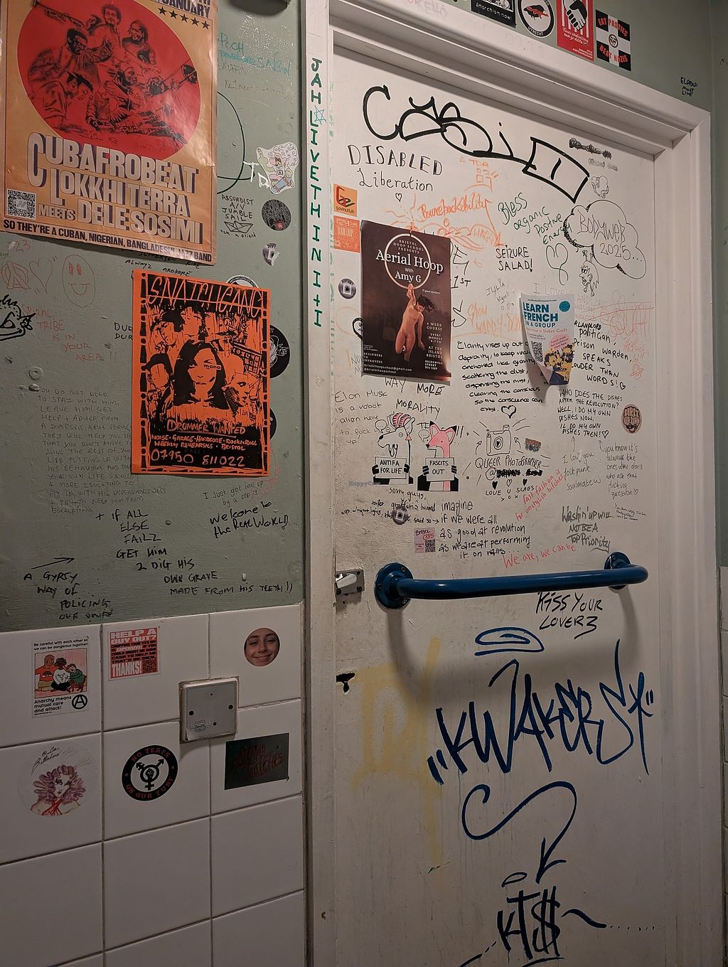 This place has a VIBE! Rustic seating, cute furry friends, gig venue toilet, an arts space downstairs and full of queers? Made me feel right at home. 😊
