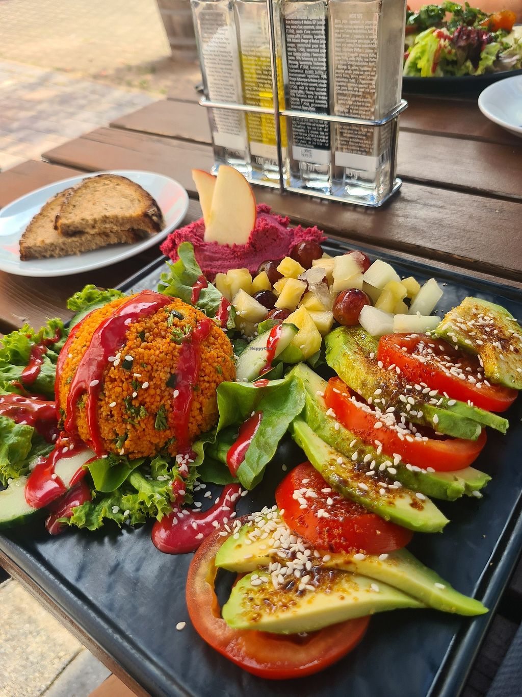 Ich habe nur auf einen Kaffee reingeschaut. Es gibt verschiedene Pflanzenmilchsorten, leider mit 50 ct Aufpreis. Die Bedienung ist sehr freundlich. In der Speisekarte gibt es auch einige vegane Gerichte (s. Fotos). Die Preise sind eher hochgestochen. Es gibt im Hinterhof auch einen kleinen Biergarten.