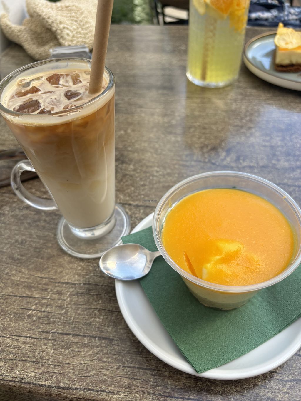 Iced latte with oat milk and a mango dessertt