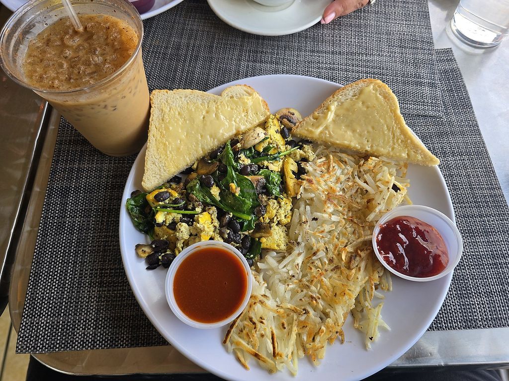 It looked like the menu had been recently updated to include recommendations to make dishes vegan. I had the veggie scramble with tofu. Black beans could also be subbed. Non-dairy milk and vegan butter was also available.
