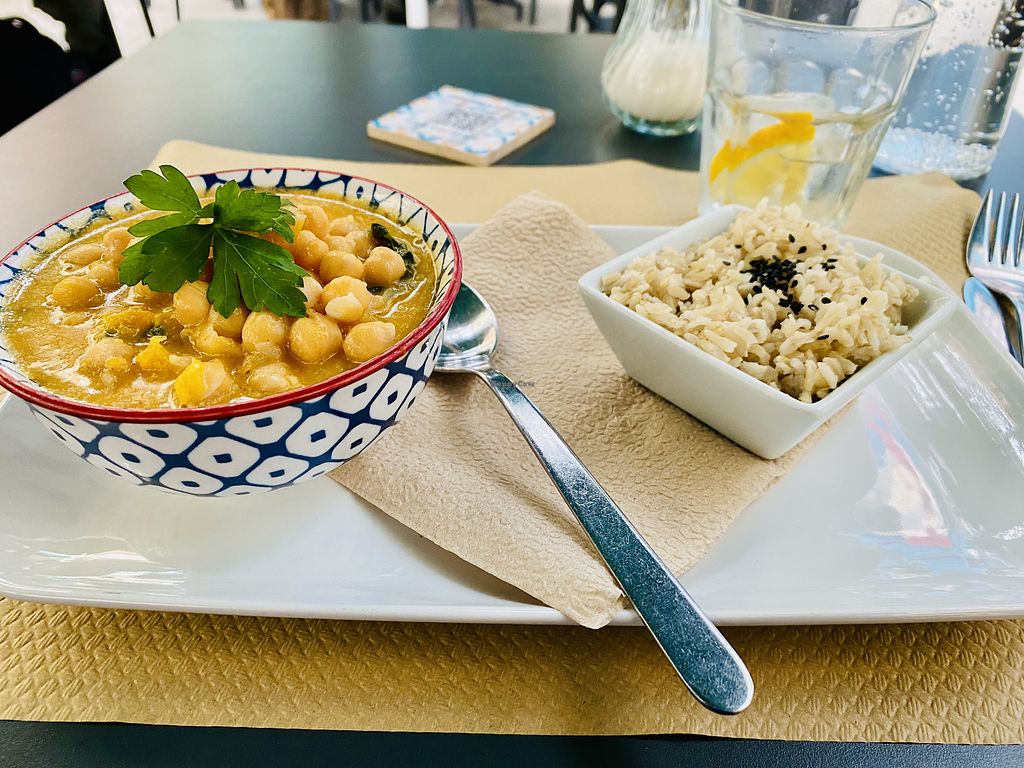Thai red chickpea curry with pumpkin, spinach, coconut milk and brown …