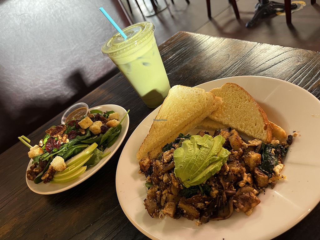 Amaaazing Tofu Scramble with sourdough toast, yummy Spinach Salad, and wonderful Matcha with soy milk!