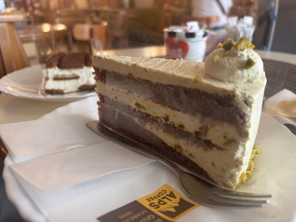 Wir haben das vegane tiramisu gegessen und fanden es sehr sehr lecker! Es gab auch belegtes Brot mit Tomate Mozzarella, Sacher torte und schwarz Wälder Kirsch- das haben wir leider alles nicht gegessen. Alle mitarbeiter*innen waren wirklich sehr nett und ich fand es schön dort zu sitzen. (Der Kuchen hat glaub ich 4€ das Stück und das tiramisu etwas über 6€ gekostet, schon also eher teuer aber finde es hat sich gelohnt)