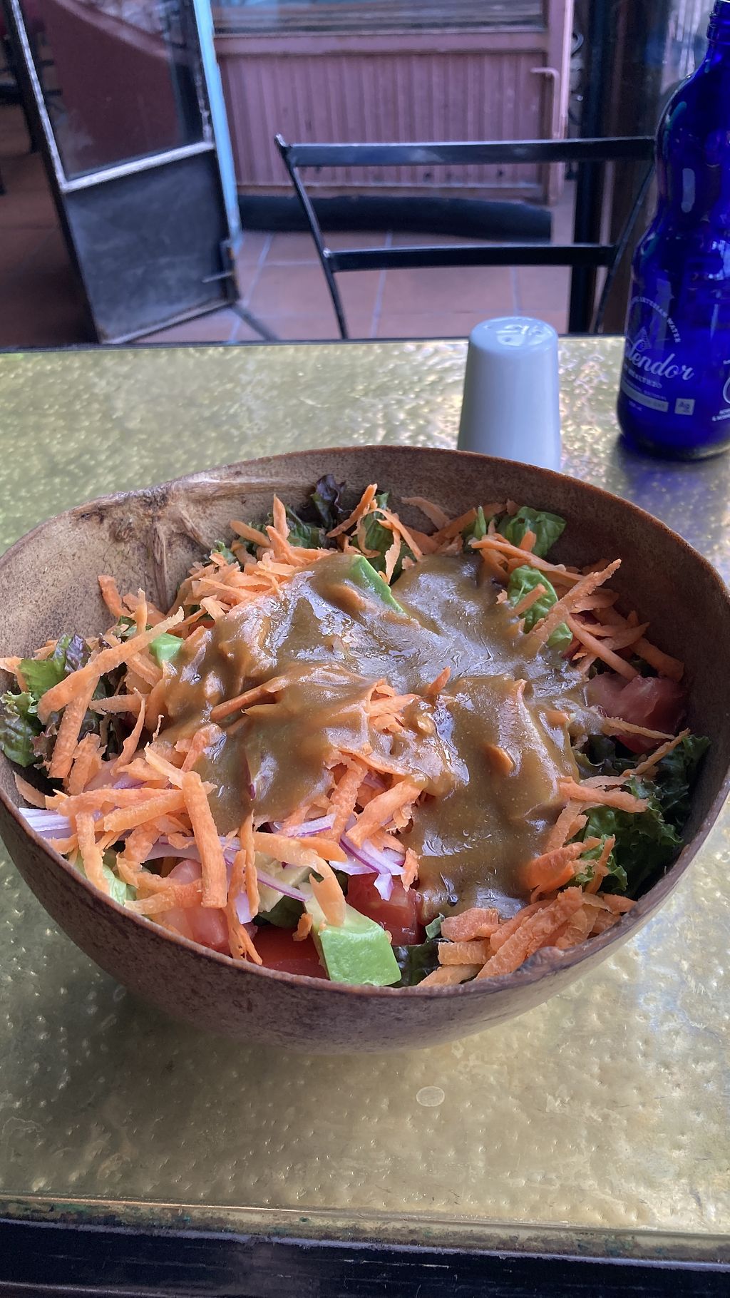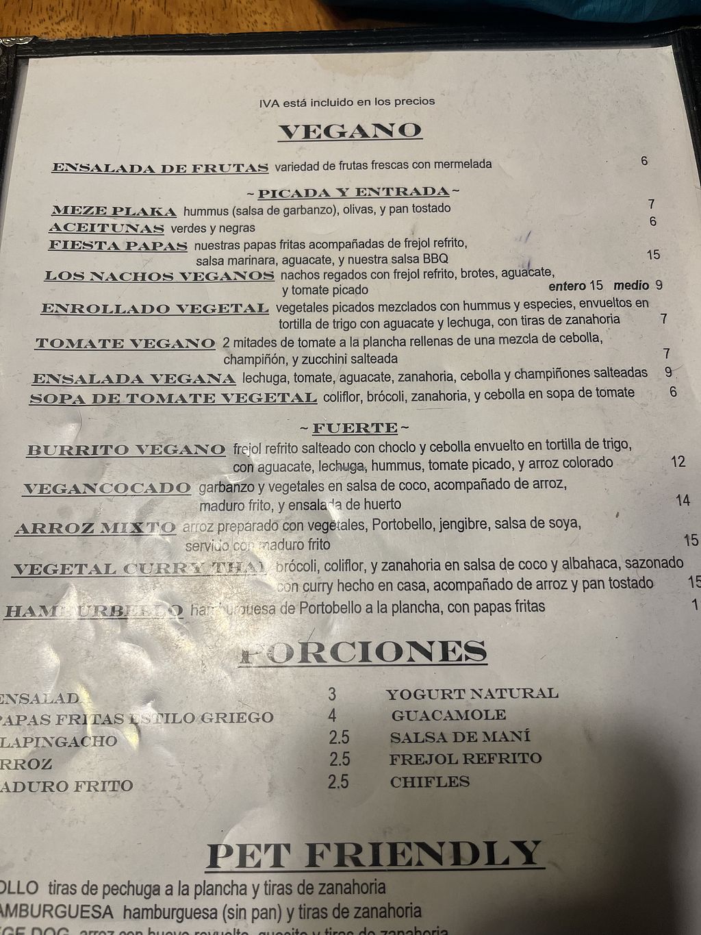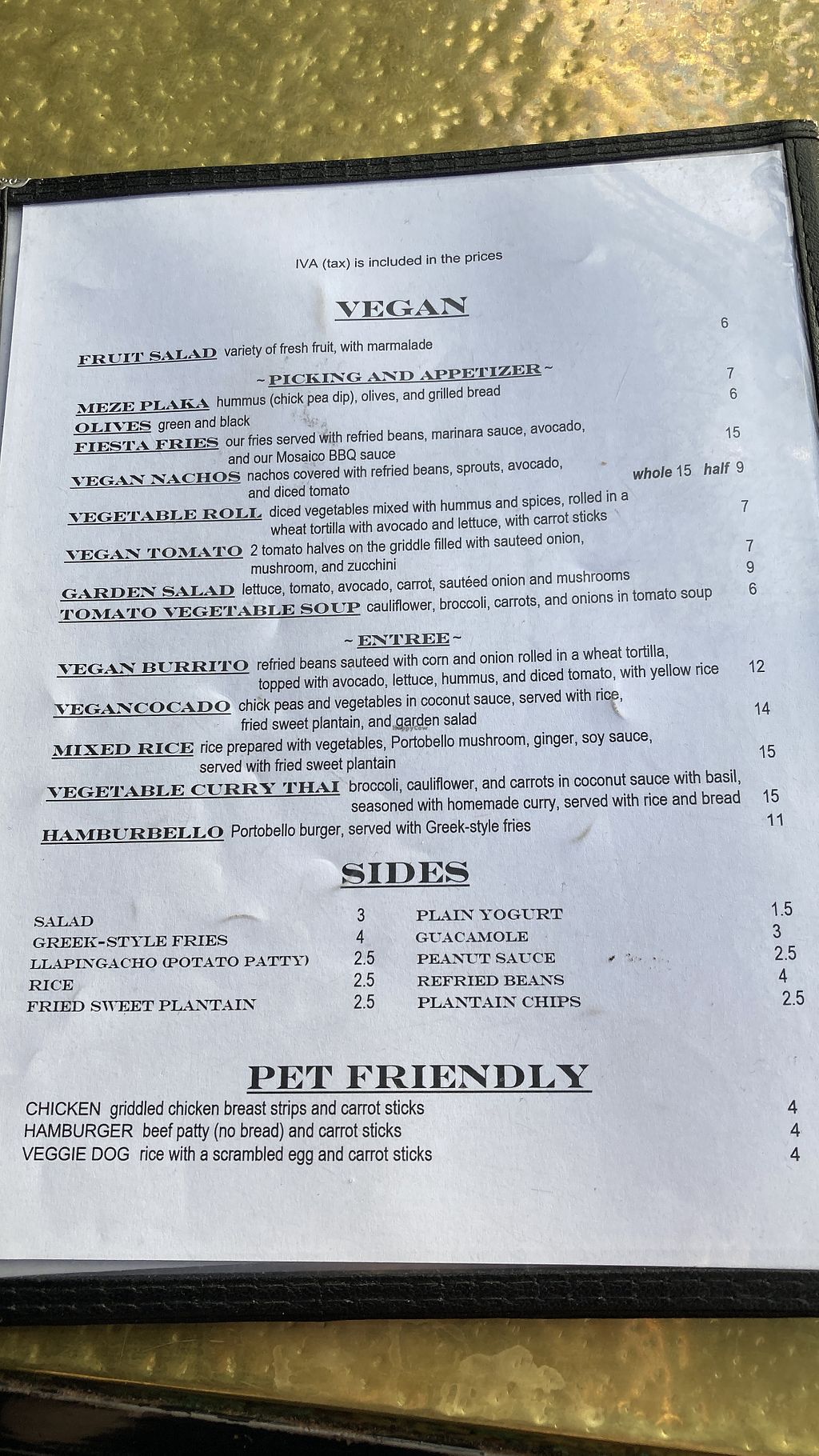 I went here on my last night in Quito as was pretty much only vegan place open on January 2 ( still holidays) and am SO glad that I did! Considering most of Quito was quiet and empty , Cafe Mosaica was hopping with patrons and dogs!🥰 Loved the fact that they had a separate vegan menu with lots of options. I ordered the burrito, simple, delicious and huge along with a lemonade! This place has killer views of the city with one-side of the restaurant practically all windows. Fantastic to see Quito lit up at night. Didn’t realize patrons could bring their dogs in - awesome! At 9 pm a band came on to play classic rock/pop and Spanish songs. There were three more dogs which came in I think with the band. Loved that!