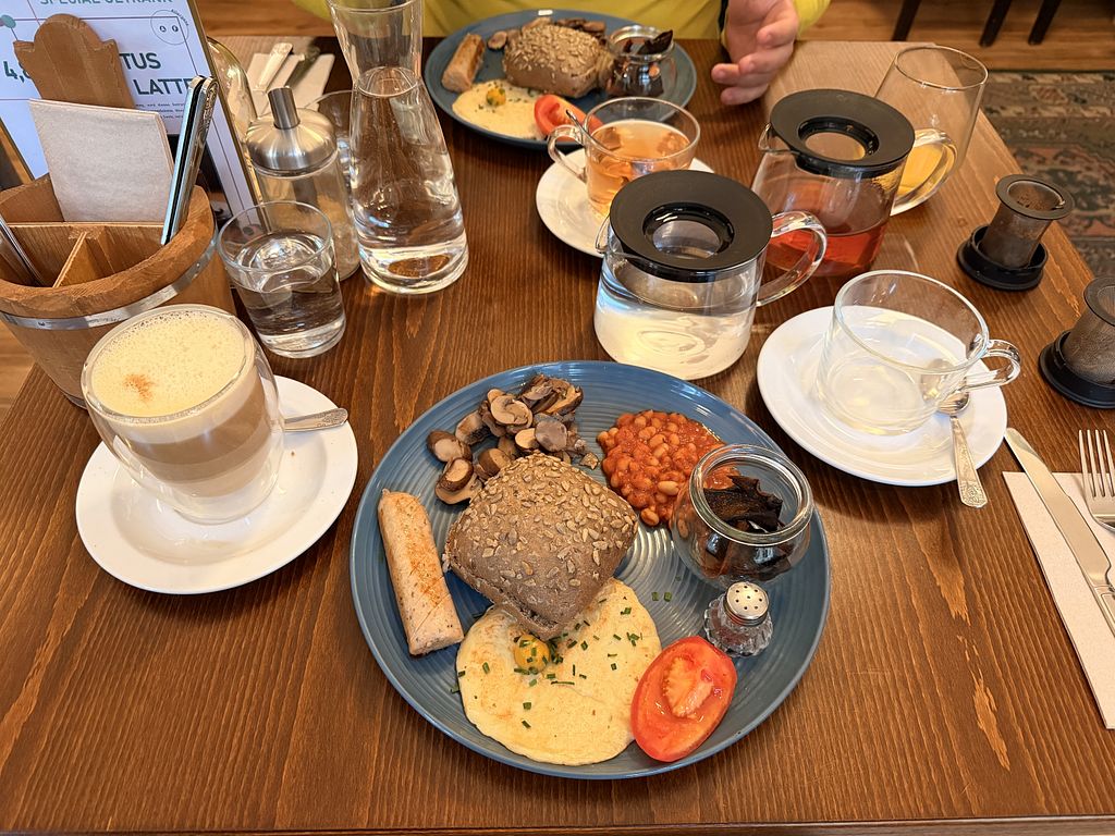 Habe das Irish Breakfast genommen, mit einem grünen Smoothie, ein Himbeerbananenbrot (super saftig), und einen Matcha Latte. Alles richtig gut.