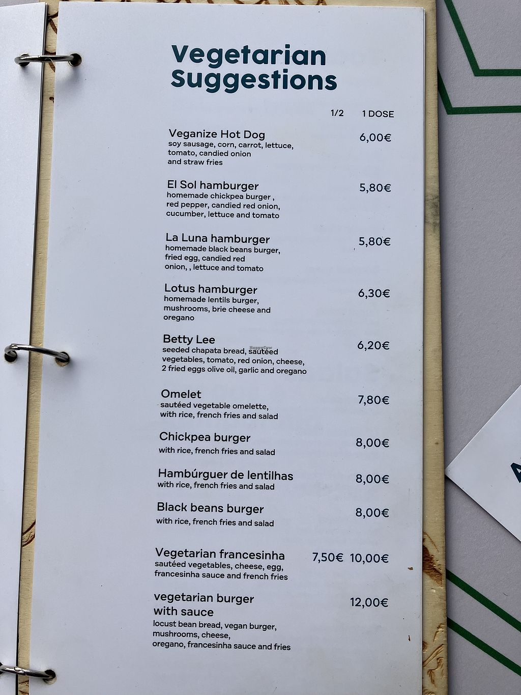 La última vez que fui solo tenía una tosta vegana, pero ayer tenía una hoja entera con diferentes sugerencias sin animales. Pedí una hamburguesa casera de frijoles con verduras y pan de semillas.
