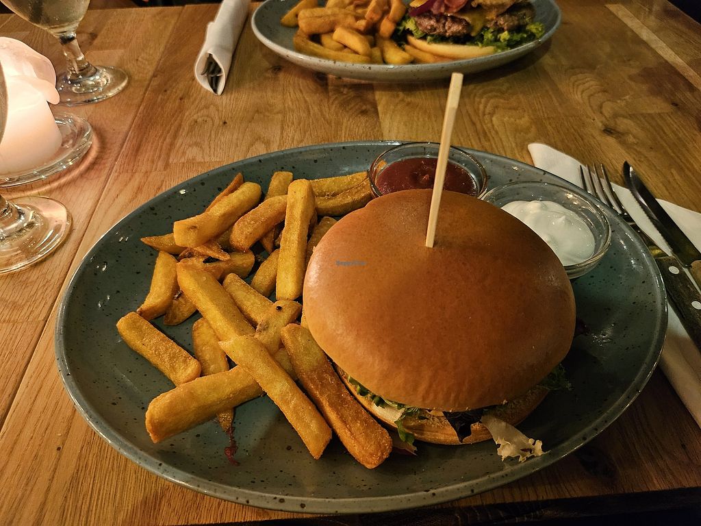 The burger came with fries, ketchup and vegan mayo. Overall, great taste, just the mayo was a bit tasteless. Especially the fries were very well done, super crispy exterior and cloudy inside.