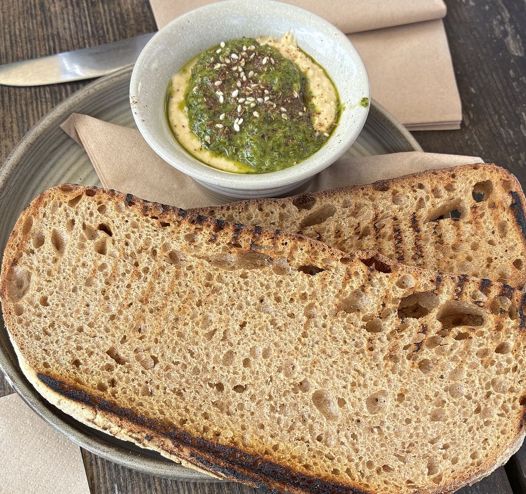Clearly labeled vegan options in Dartmoor, amongst them a vegan burger, hummus with sourdough and vegan fritters. Beautiful outdoor seating right beside a historic church. Small minus: plant-based milk is more expensive than cow milk, seems outdated.