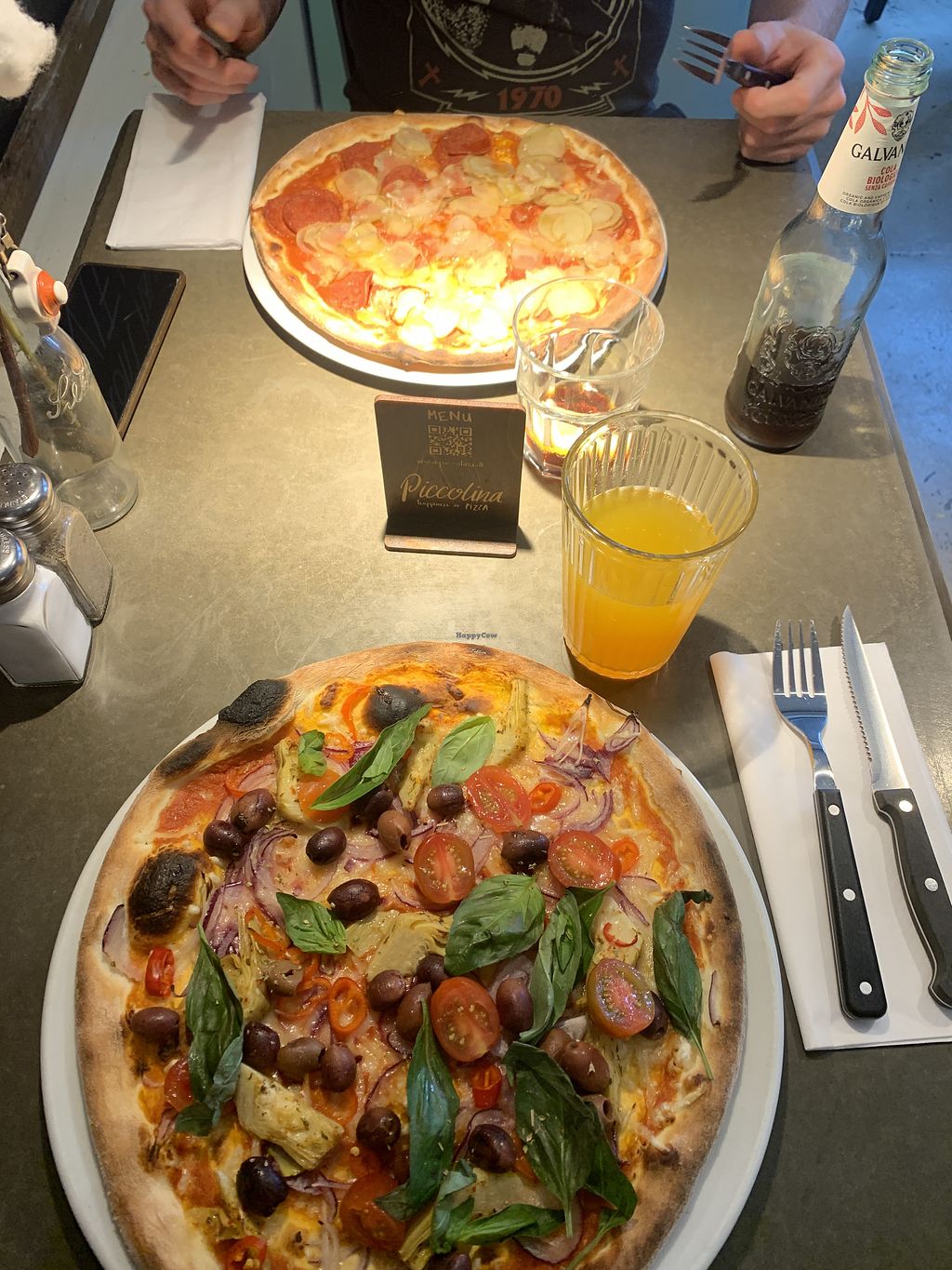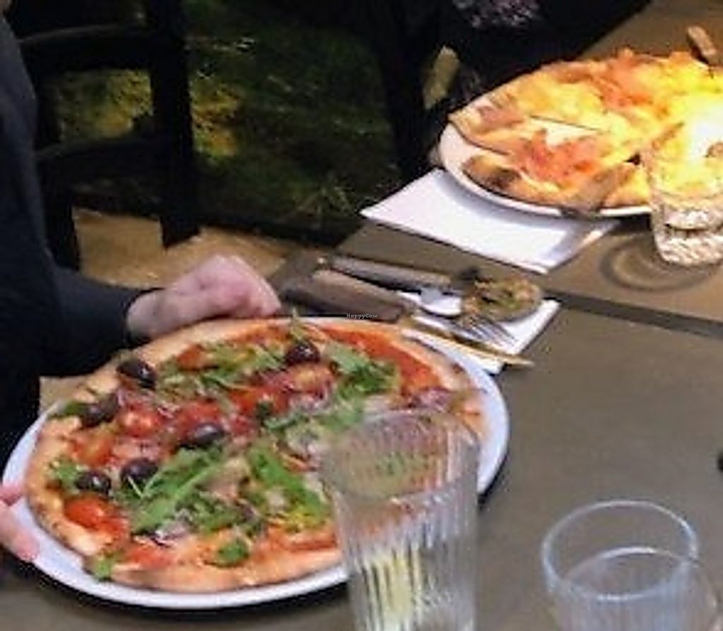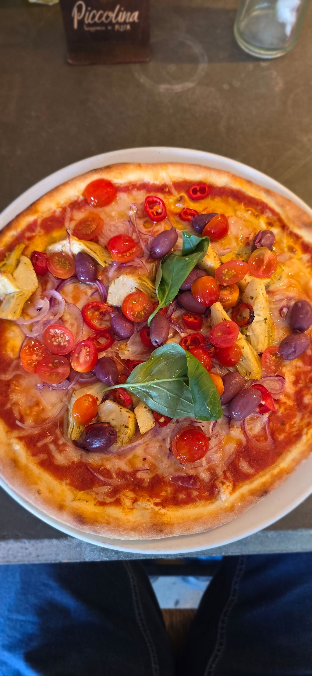 Pizza 105 (principessa) with vegan cheese, vegan salami, artichokes, o…