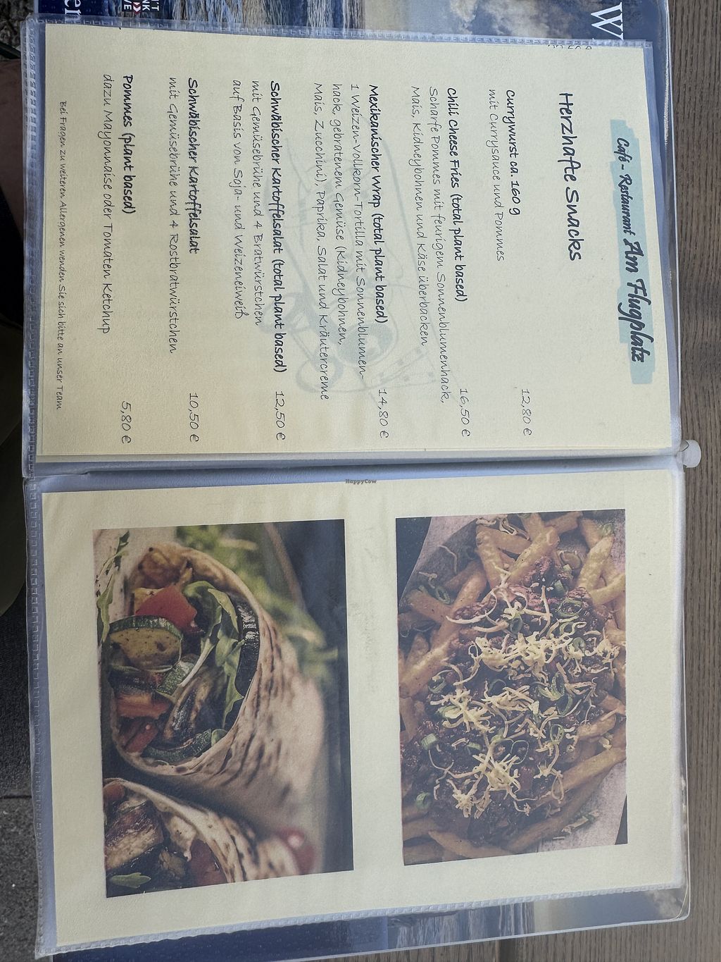 Serves meat, vegan options available. Cafe and restaurant on a small airfield. Has vegan cakes and oat milk for coffee drinks. The menu includes several vegan dishes as well. Reported closed January 2026.