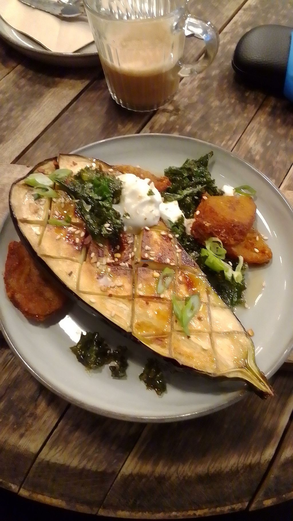 I had the miso aubergine with fried plantain and crispy kale. Such great flavours. I liked it that they have a sign up advertising that oat milk is the default for hot drinks, with customers having to ask if they want dairy. Definitely recommend a visit here.