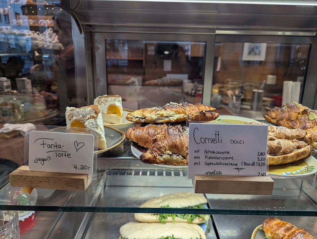 Zudem gibt es immer wechselnde vegane Kuchen und veganes Focaccia.