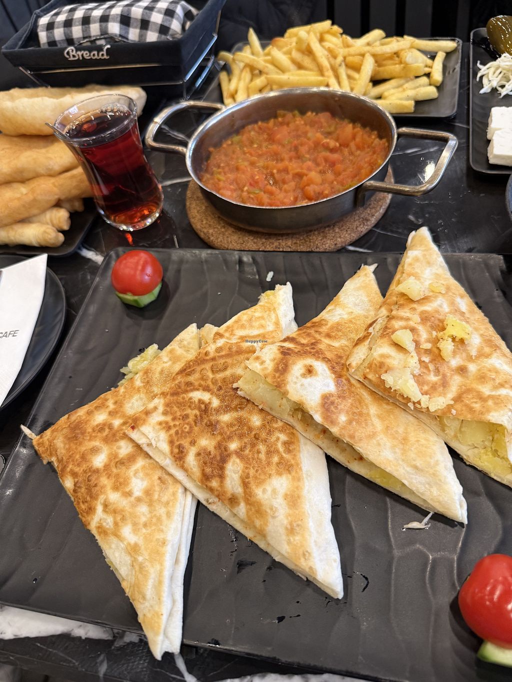Serves meat, vegan options available. A casual café in Beşiktaş specializing in traditional Turkish breakfast (kahvaltı). The menu includes several items that are naturally vegan or easily modified. The popular fried dough (Pişi) is vegan-friendly when ordered plain. Other plant-based choices include vegetable stuffed flatbreads (Gözleme) with spinach, potato, or mushroom (ordered without butter/cheese), as well as sides like French fries, seasonal salads, olives, jams, and tahini with molasses. Open Mon-Sun 7:00am-6:00pm.
