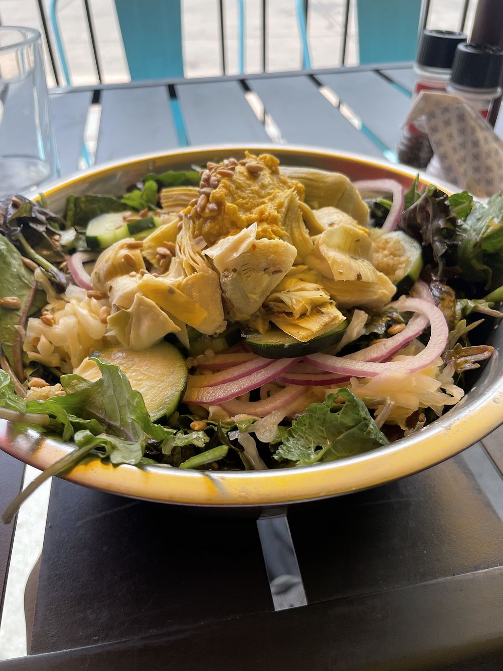 Establishment is really busy, but they have a lot of seating. They also have outdoor seating that is dog friendly. My husband had a mushroom Panini and I had a Greek salad. Both meals were made vegan by removing the cheese. The Greek salad was huge! A lot of artichoke hearts and other goodies. Could easily have been split between two or three people.