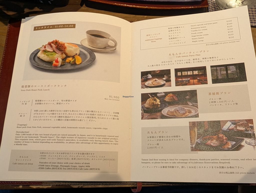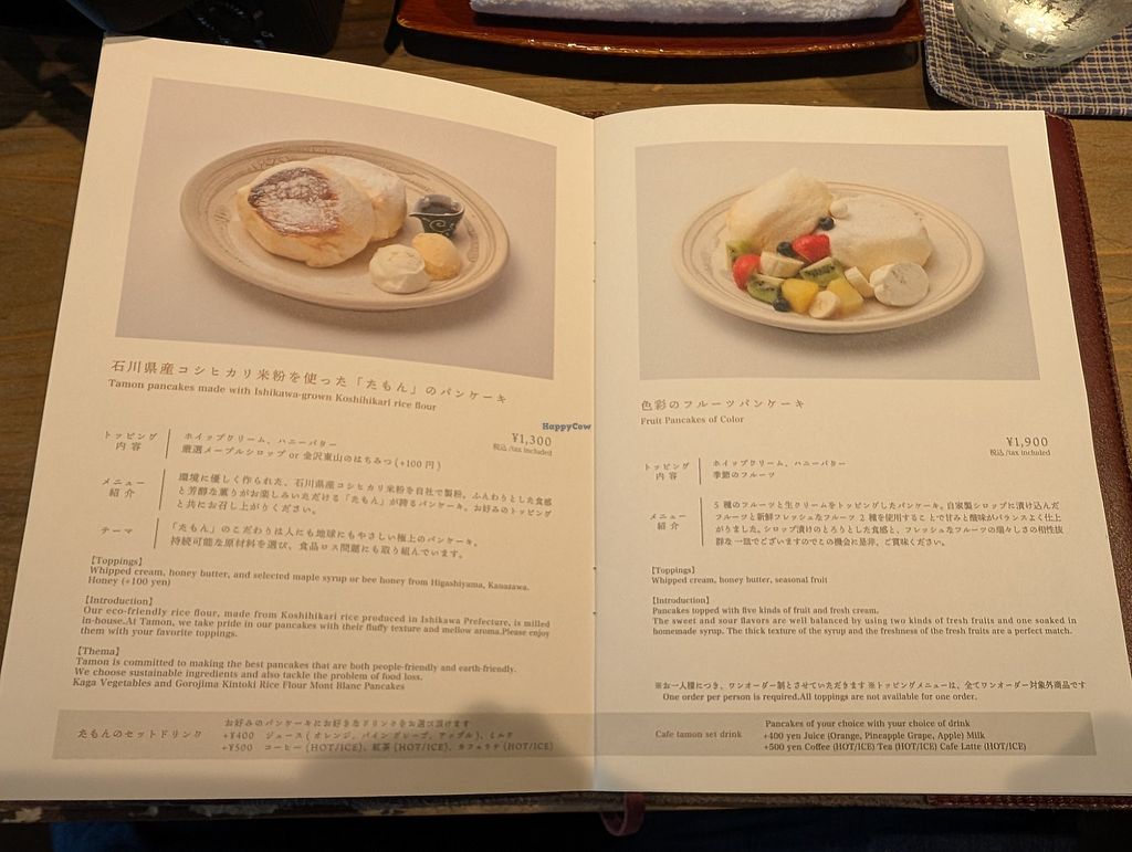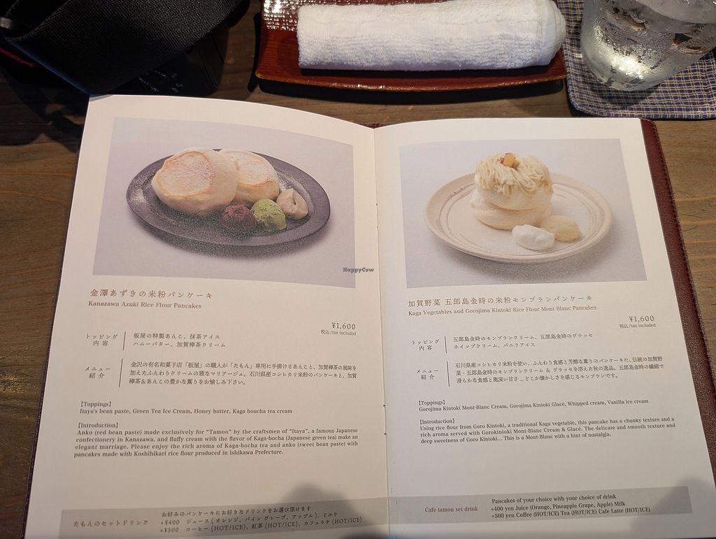 Serves meat, vegan options available. Restaurant with some vegan options, including rice flour fluffy pancakes, tamon pancakes, fruit pancakes, and azuki pancakes. Removed June 2025: Limited vegan options.