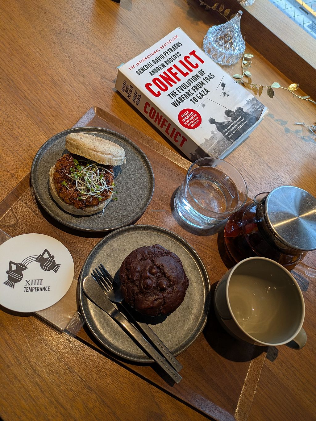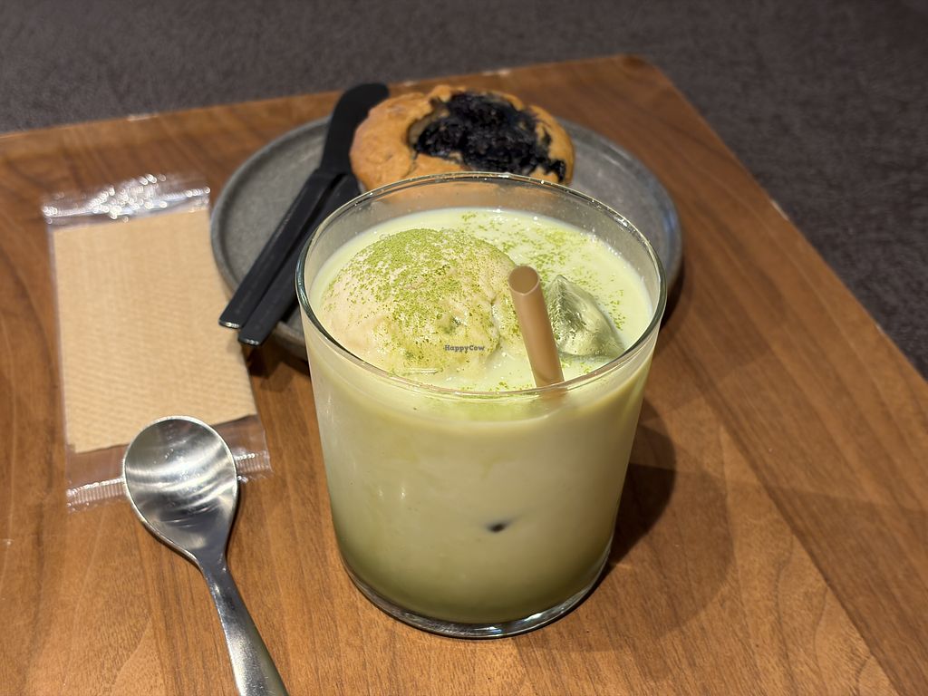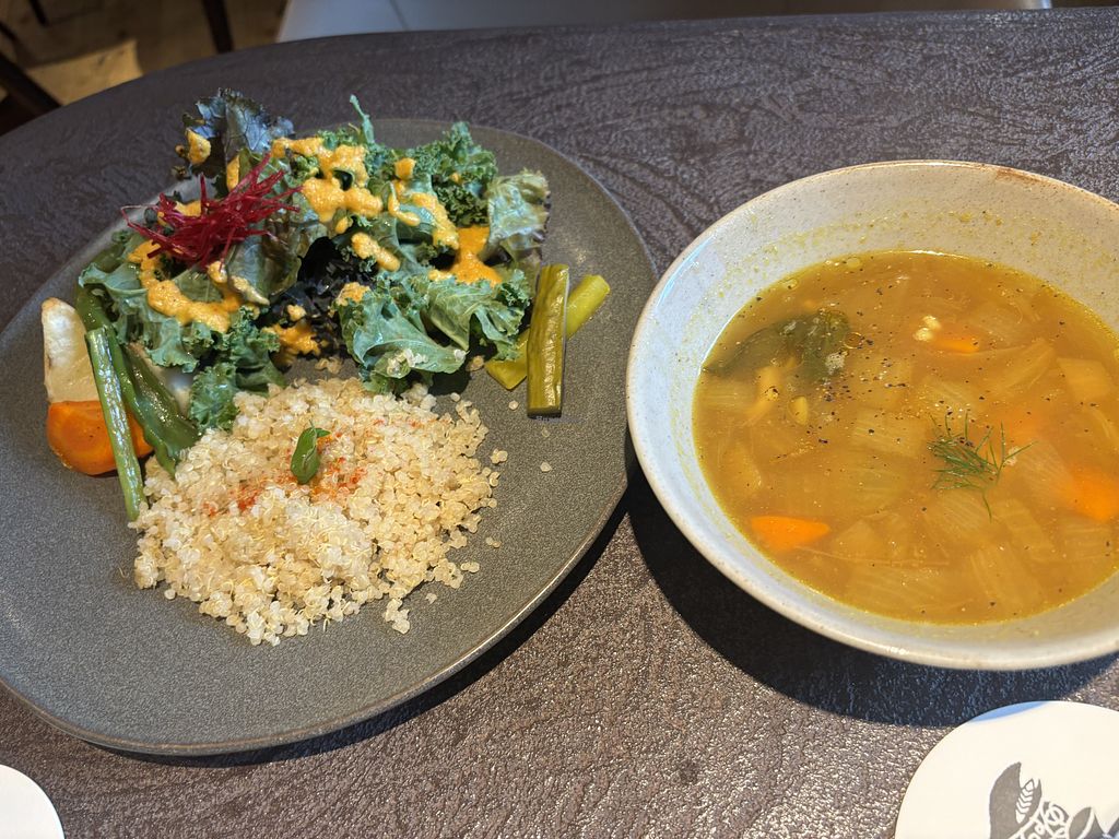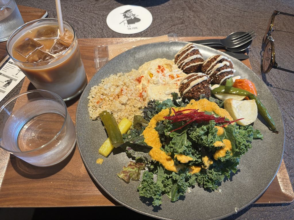 Falafel plate with side soup + iced organic matcha