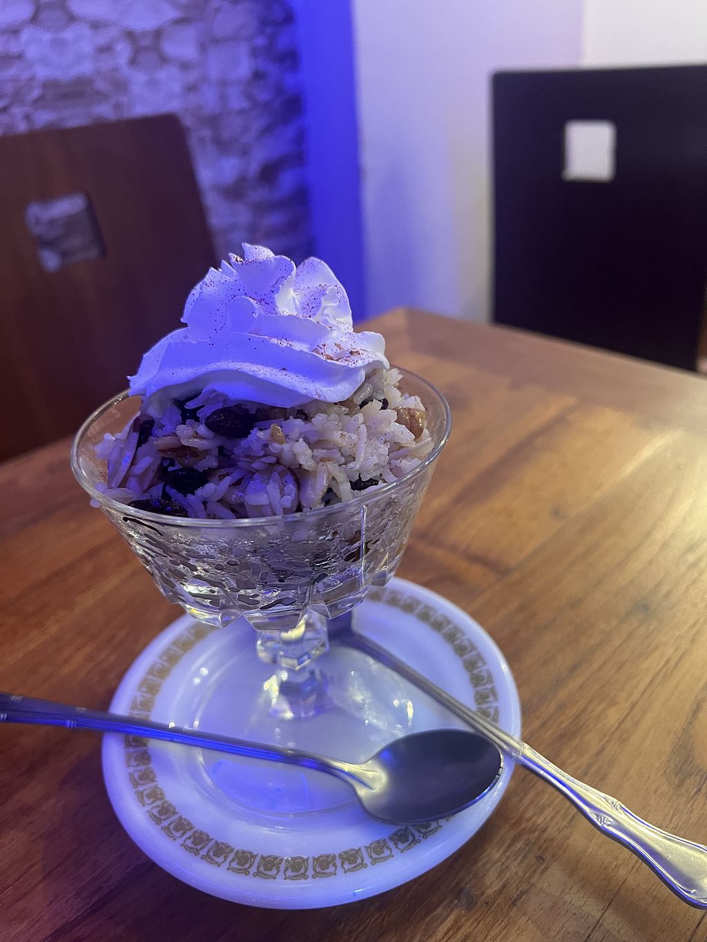 Bhaktsa-Marku, pasta brown sugar with butter. Whipped cream topping added! Want sure what to expect but nice tasty finishing touch. Chewy and sweet small pellets of pasta.