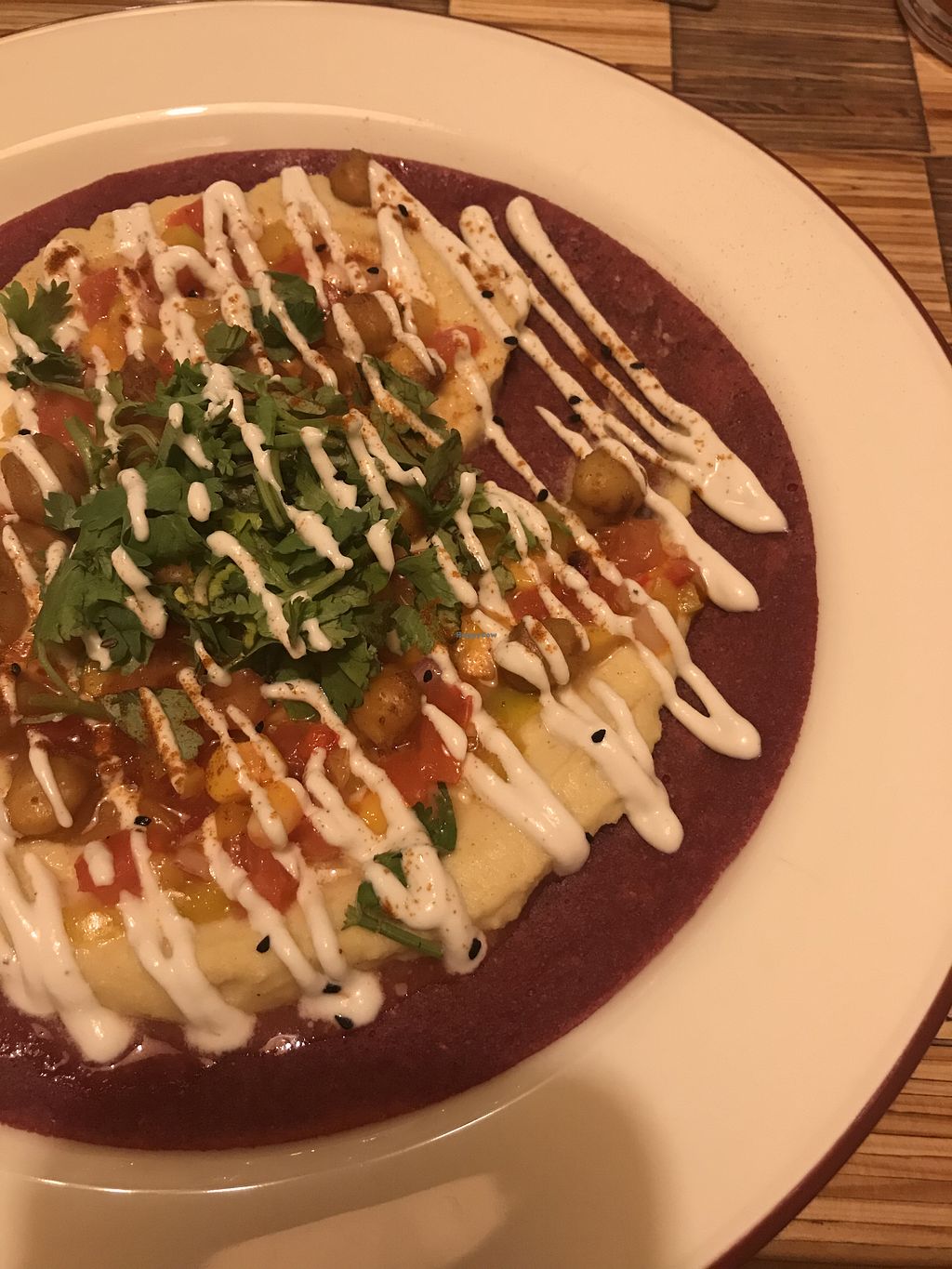Very cosy place with lots of vegan options. We started with the special toasts, a selection of whole wheat bread with three different spreads, including their “red fish” paste made with carrots, and their purple cabbage soup with beetroot raw bread