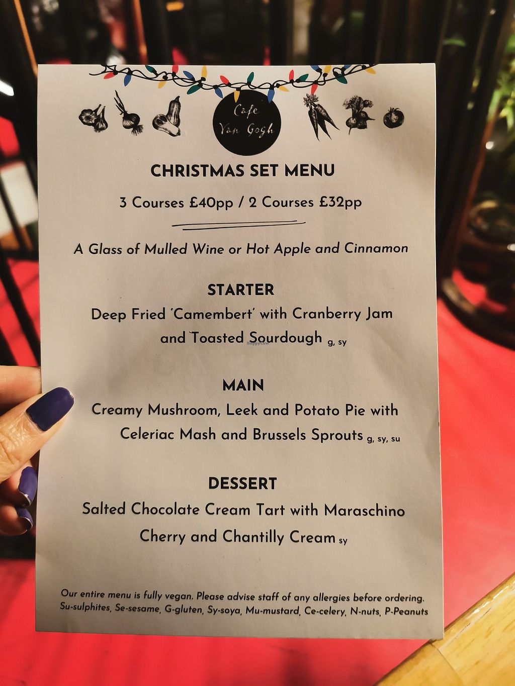Had the 3 course Xmas dinner...absolutely delicious...hot apple and cinnamon drink, deep fried camembert to start, lovely pie for main and a superb tart for dessert. Only downside was the brussels were quite hard! Staff really friendly.