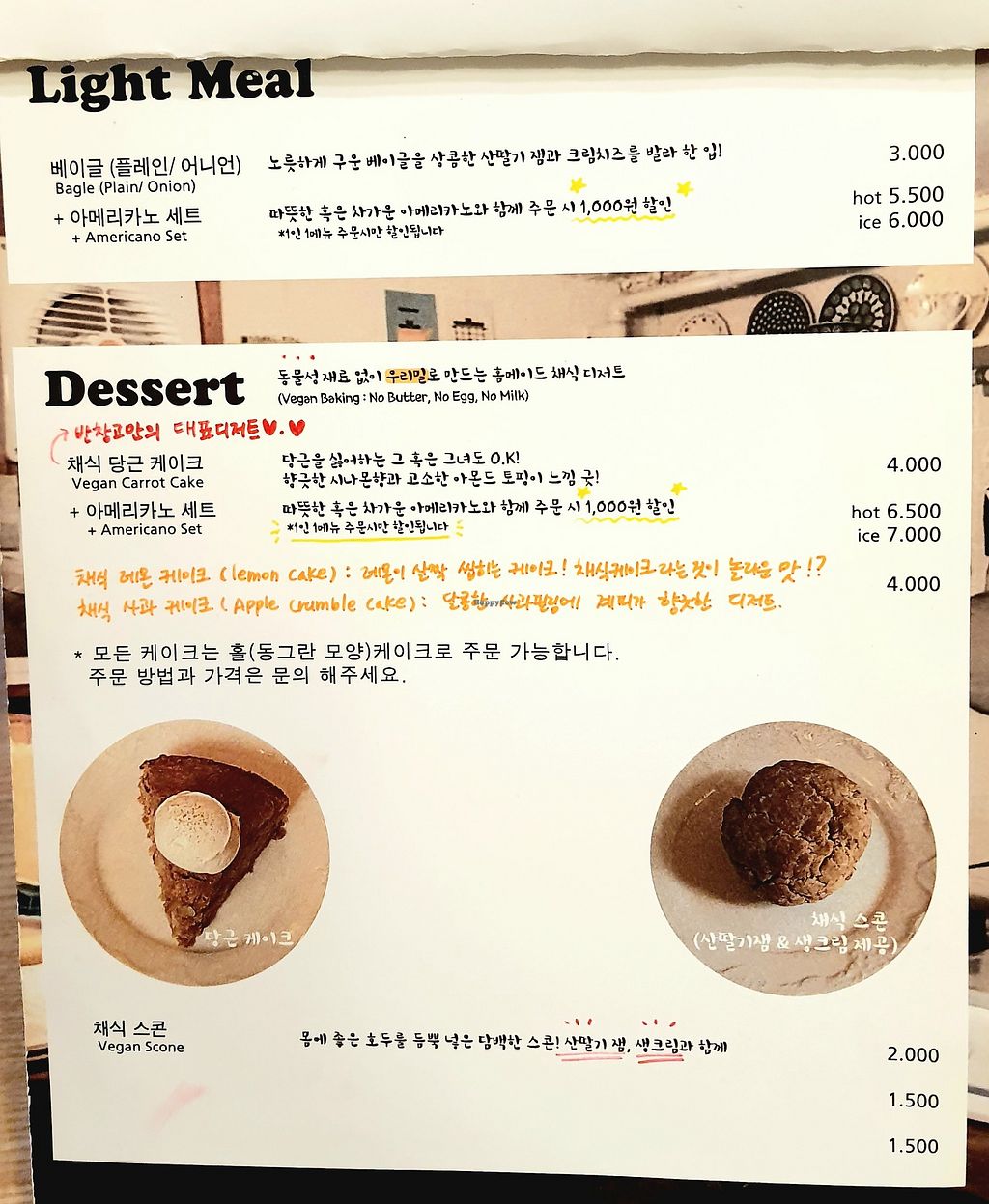 I stumbled over this place by coincidence, just seeing the little blackboard outside stating 'cakes - no dairy, no eggs' (inside they state more explicitely that they are vegan). They have a small selection of vegan cakes (apple or carrot; 4k won), scones and muffins (~2.5k won if I remember correctly), coffee and tea. The place is very cozy and nice to hang out (free wifi!) and the staff speaks ok English.