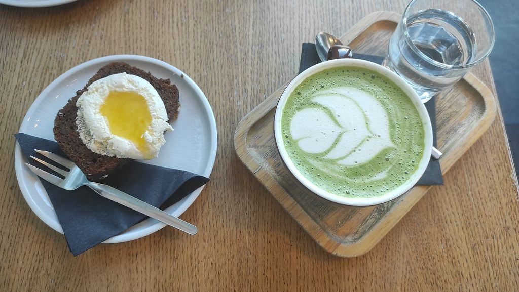 Raspberry matcha latte and some cake