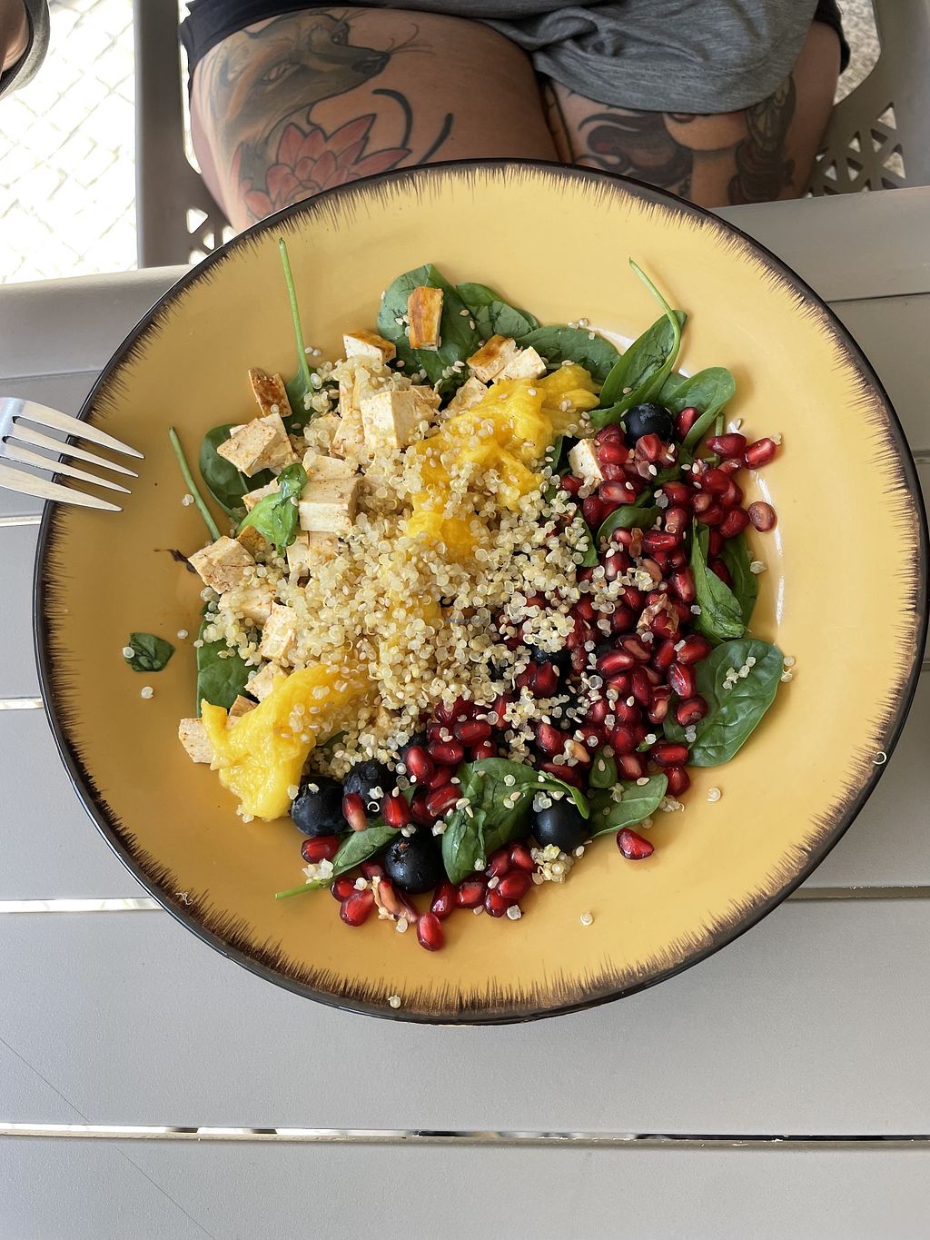 Tasty tofu and mushroom in the Asian bowl. Avocado wasn’t ripe so they subbed in pomegranate.