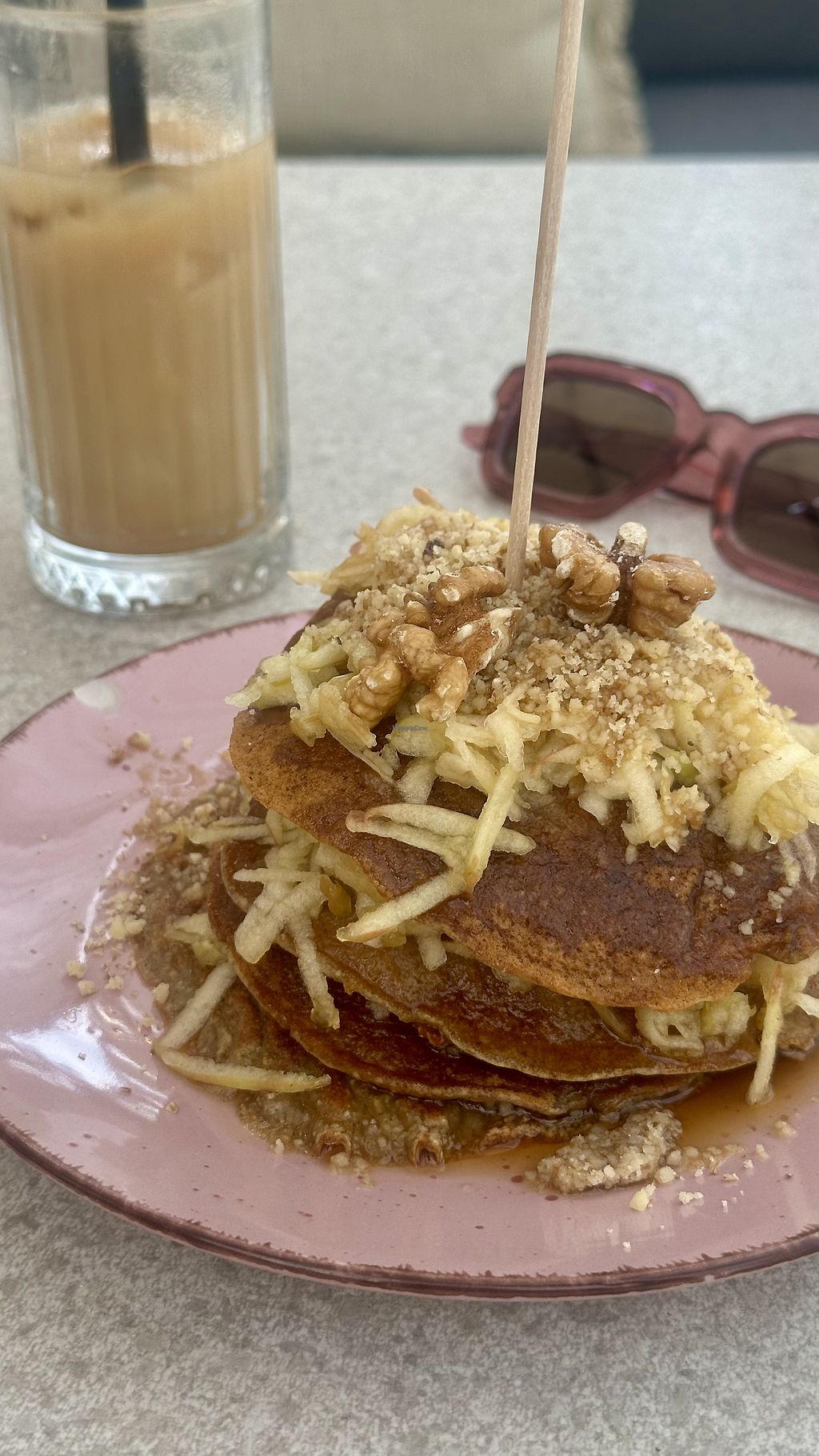 Even though it is an omnivore place, vegan options are clearly marked and actually very nice, including the vegan pancake stack!! The apple-maple-walnut one was amazing, the choco-banana ok (is just the choco sirup). They cost 9,90€ for a stack of 4 pancakes that are very filling. Coffee has several vegan milk options. There were also savoury vegan options in the menu.