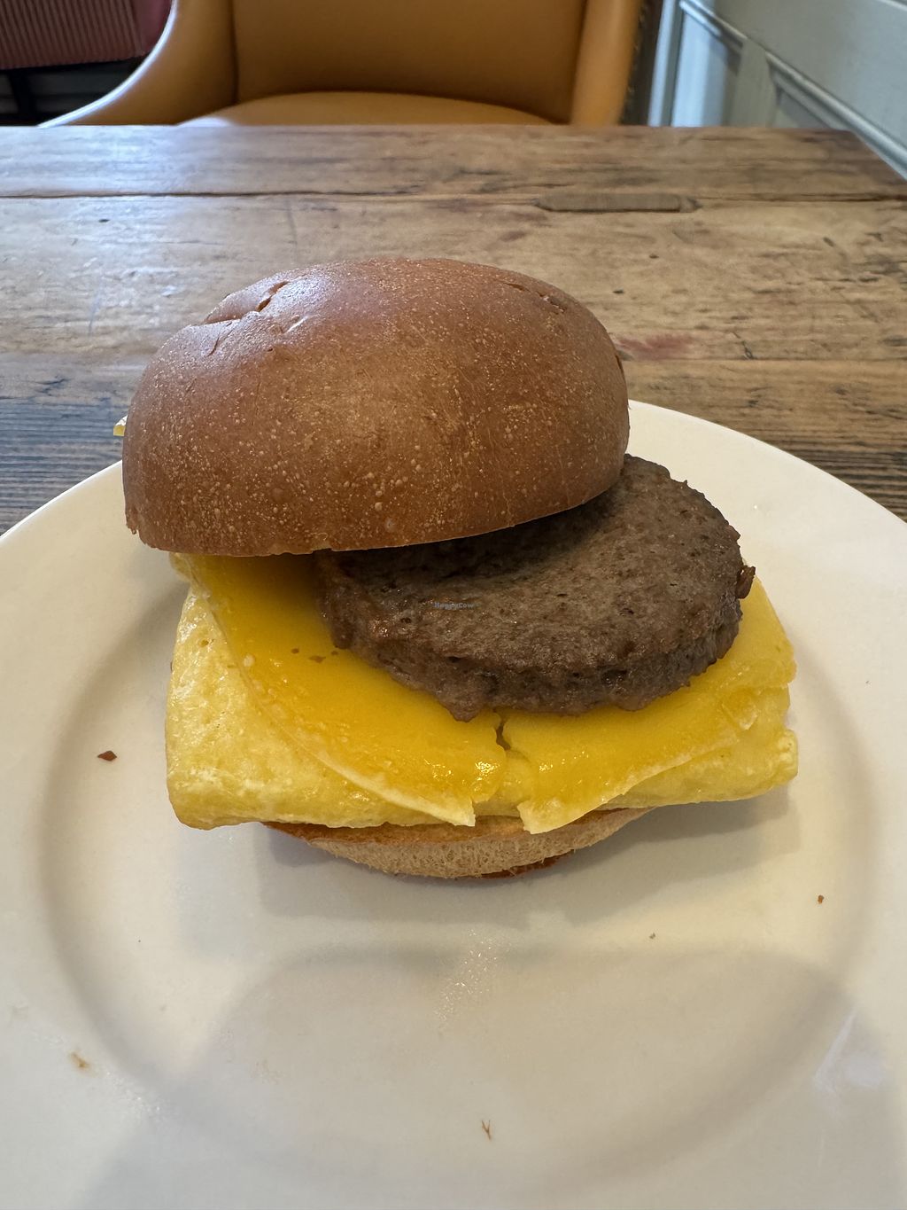 I had the vegan breakfast sandwich this morning. It was really tasty, and the “cheese” was still melted although it was a while before I could eat it. They also have plant milks for their beverages.