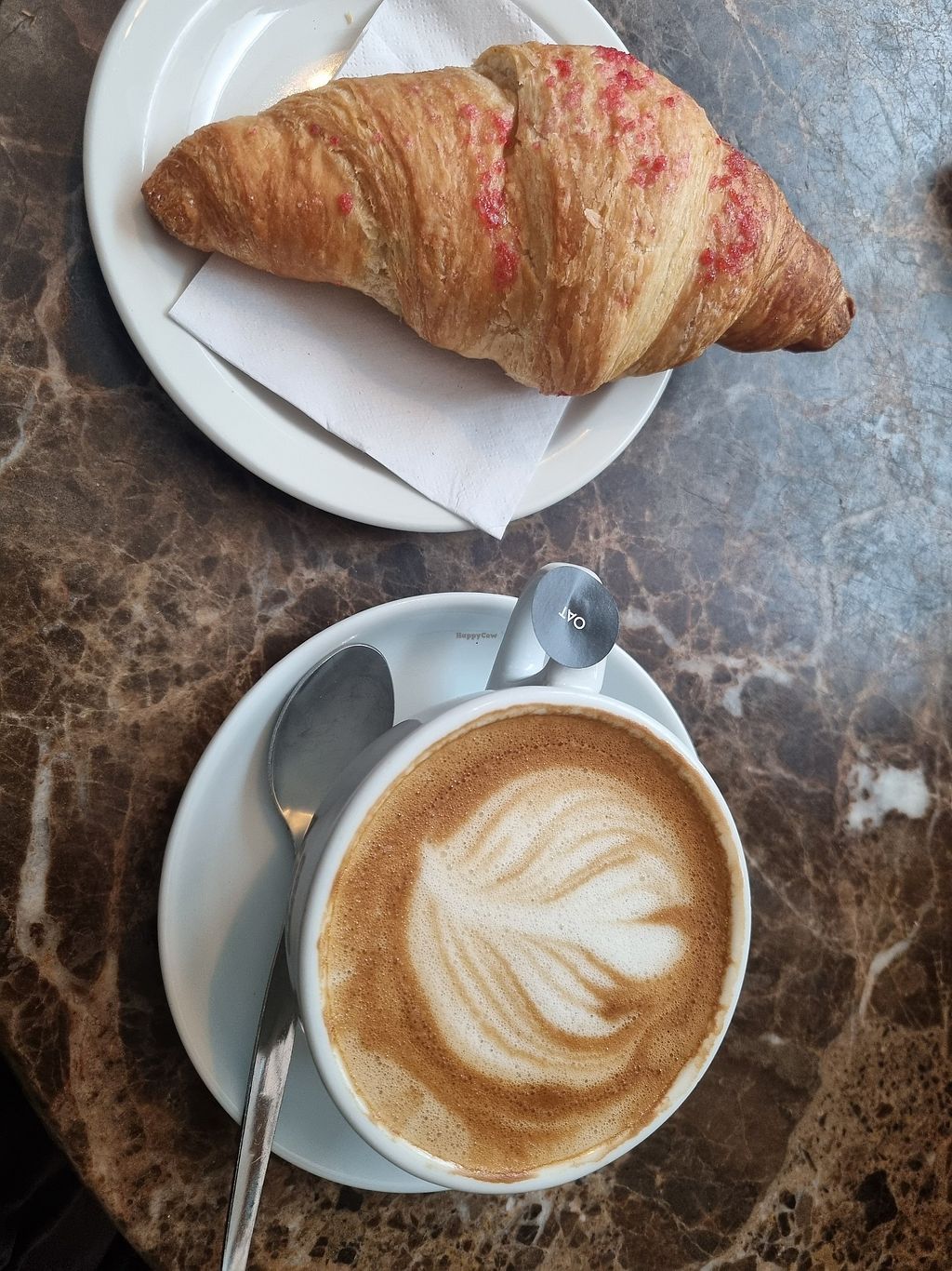 raspberry croissant and flat white with oat milk