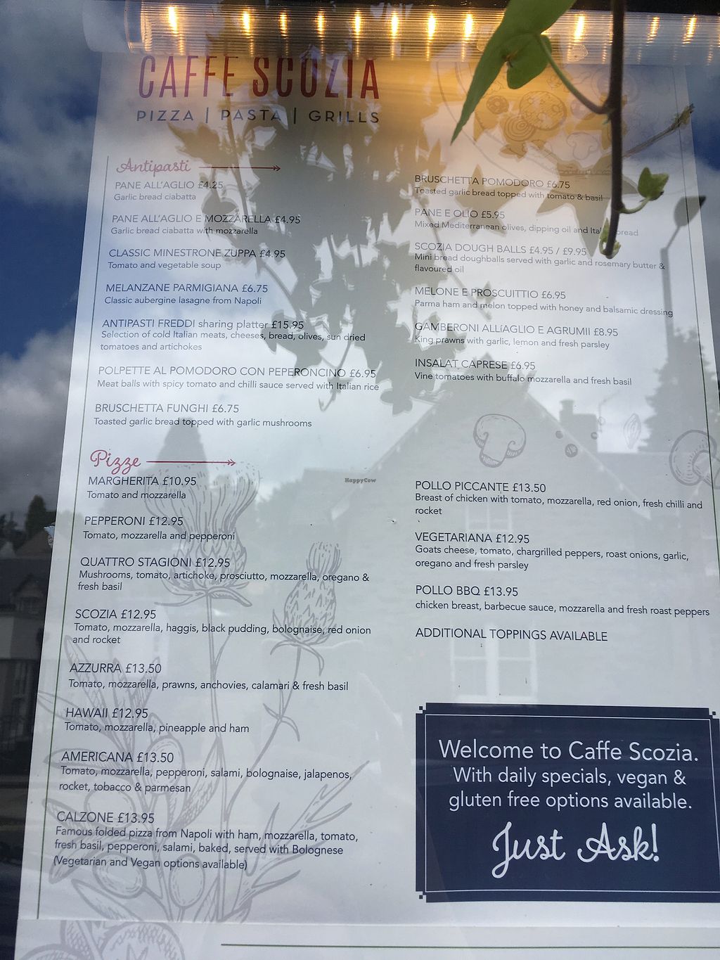 I visited Cafe Scozia after seeing that their menu had some marked vegan options and I was impressed with the staff's knowledge about the menu items and their recommendations of other things on the menu that could be made vegan. I had the Quattro Stagoni with olives instead of ham and with vegan cheese. I think they use a rice cheese as it melts really well. I also tried the ice cream, the chocolate was particularly good. You usually get a trio of flavours but they'd run out of vanilla.