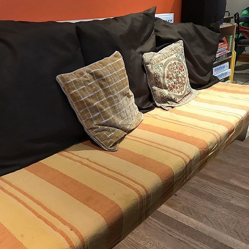 Very nice little cafe with comfortable sofas and really good tasting homemade food. There are lots of choices also for vegans. The menu is long. There are breakfast all day, all kinds of sandwiches, wraps ect. and lots of main courses, side dishes and salats. We had rice, sausages(which i think were homemade and very tasty) in gravy and salat plus some lentilsburgers with homemade bread. There are cakes even vegans(and not just raw cakes), milkshakes and more. The taste and quality of the food is a good deal above average. One thing to improve would be the milkshakes which were made on syrup and a bit sweet. Would prefer fresh fruits in them instead. Portions are a bit small but then there are of course room for a snack before or dessert after:)