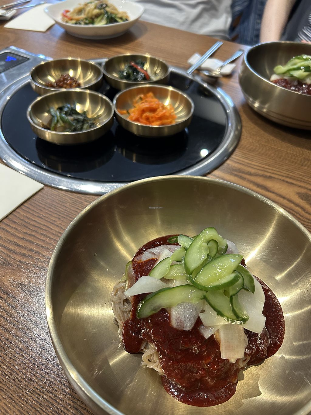 Dolsot bibimbap after adding sauce and stirring. It goes crispy in the…
