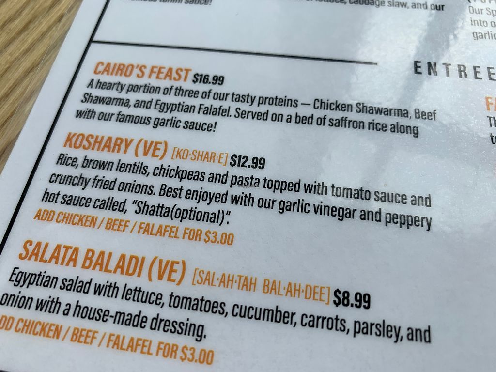 i love to get the koshary with shata and falafel on top and it is literally so warm and filling and delicious !! sometimes i like to shake it up with the falafel wrap and fries which are also awesome; their fried cauliflower is also delicious. when i was sick i got their lentil soup and it was so yummy and noirishing feeling. love the food its always delicious.