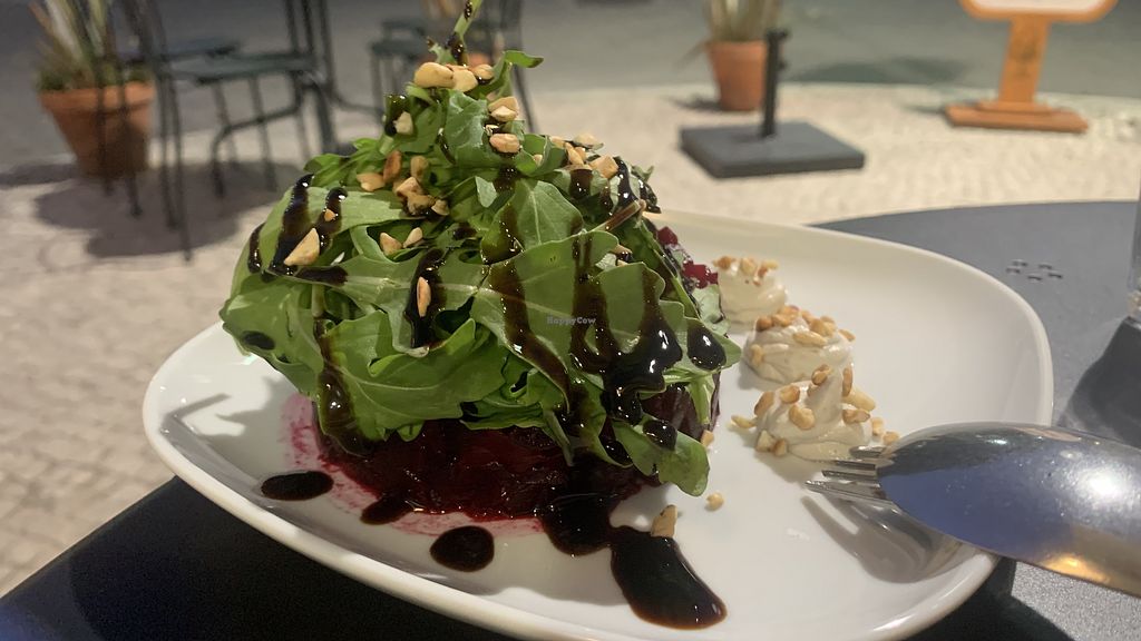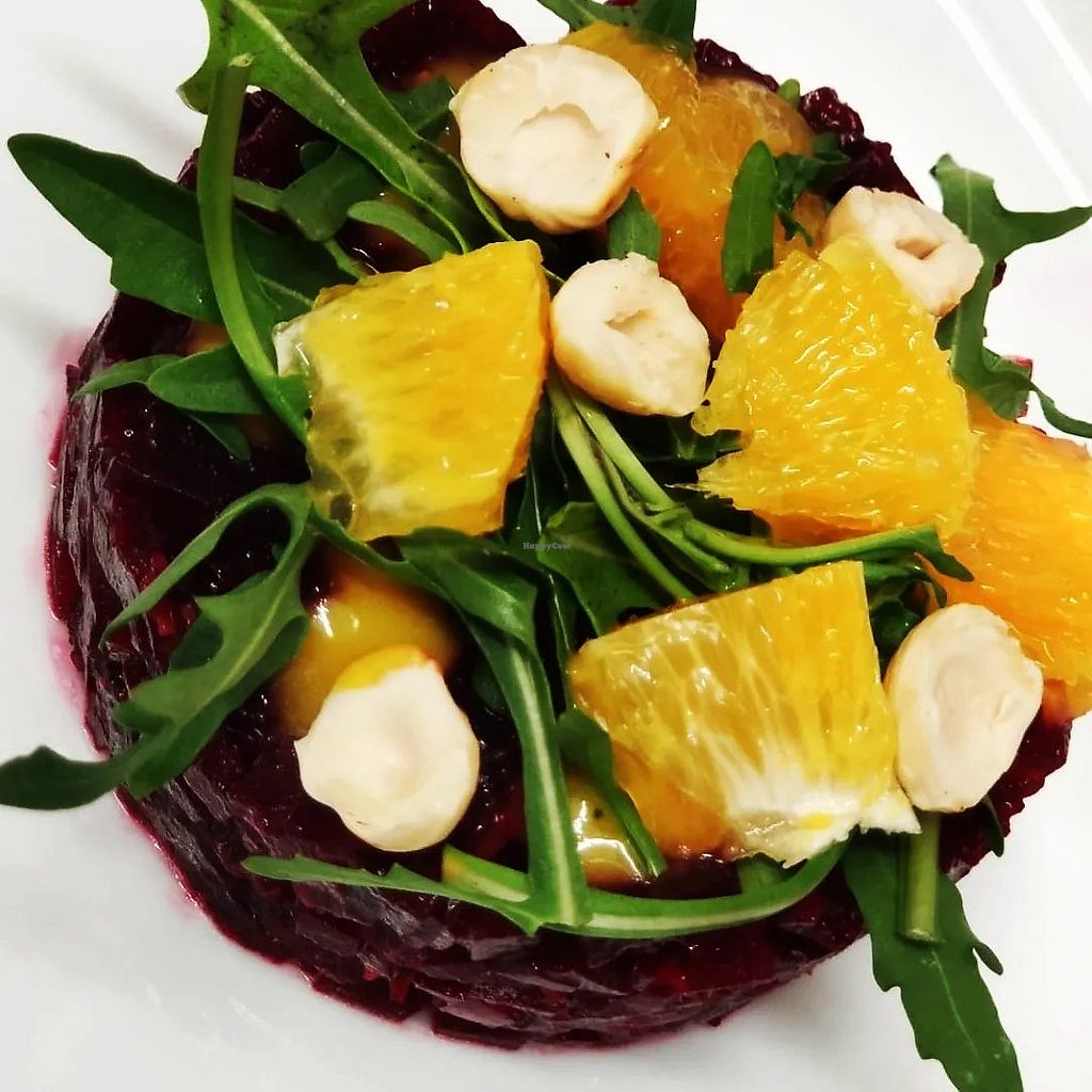 Beetroot tartare, orange, cashew cream cheese with rocket