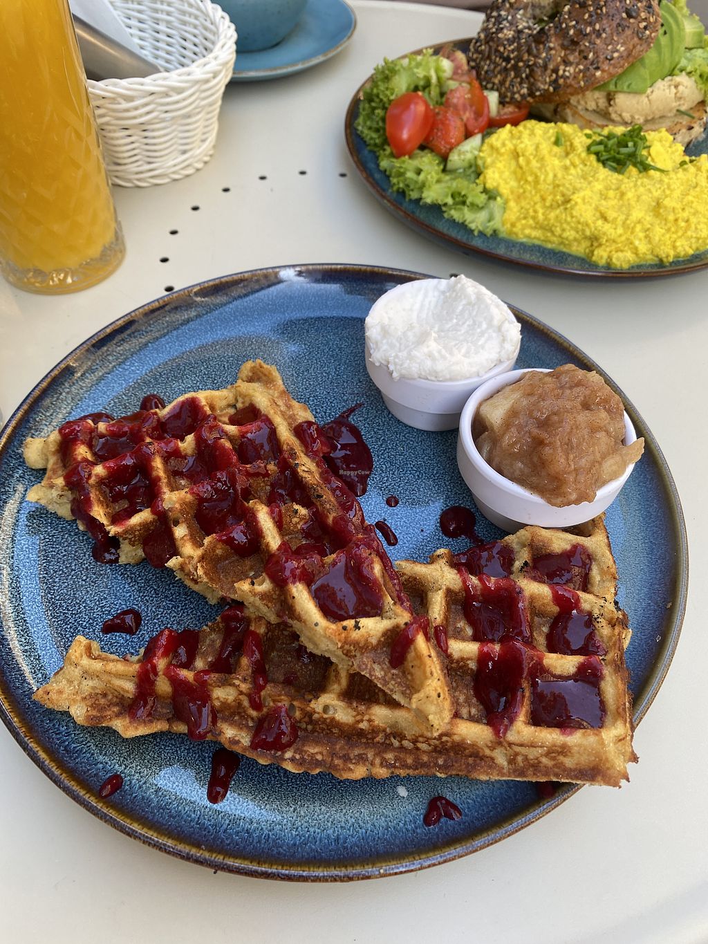 Sugar free waffles, with berry sauce - customised here with coconut cr…