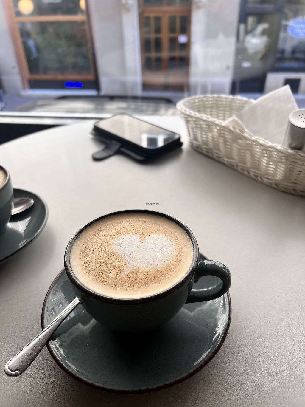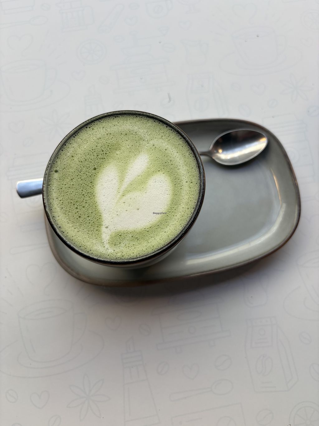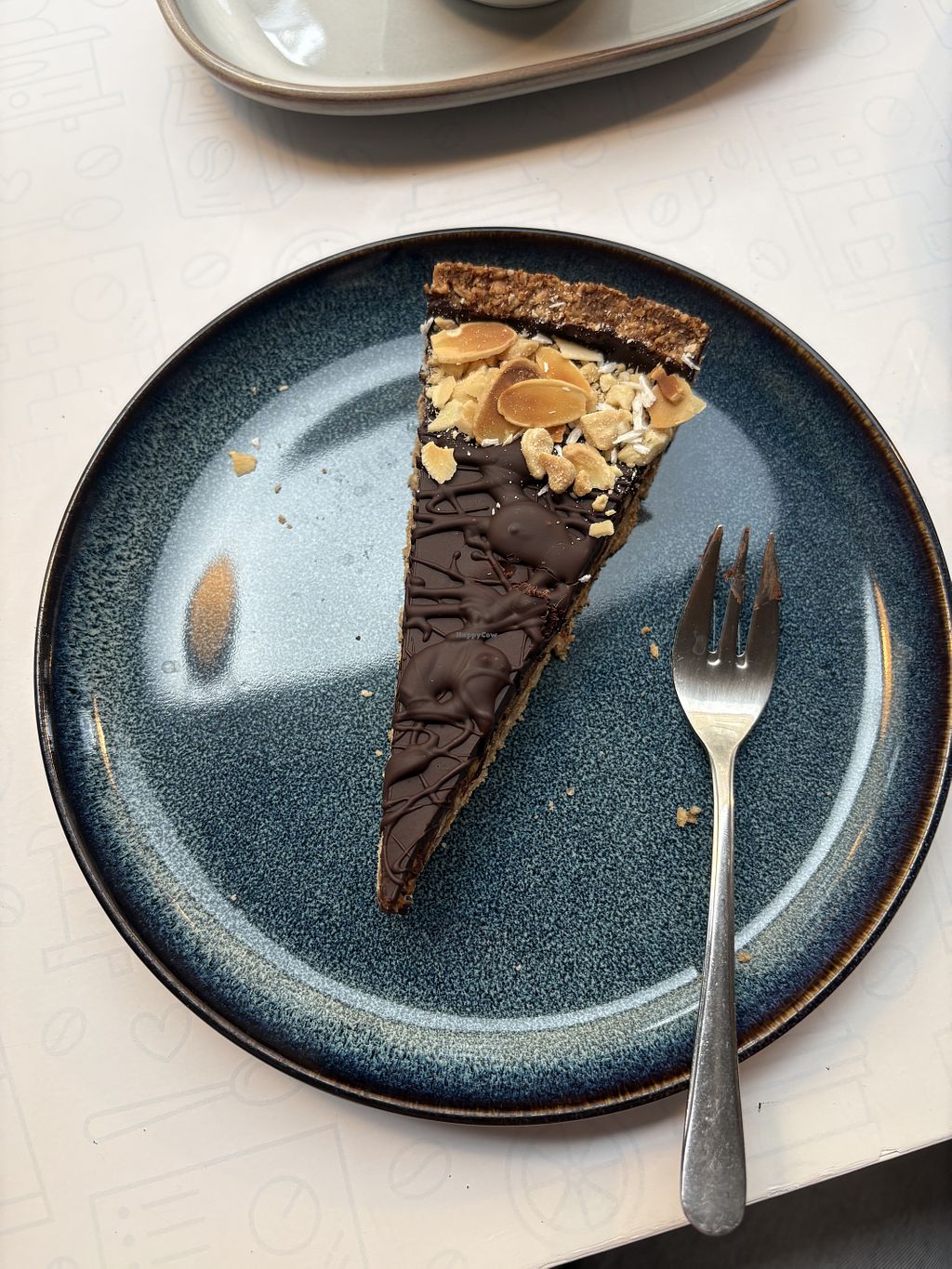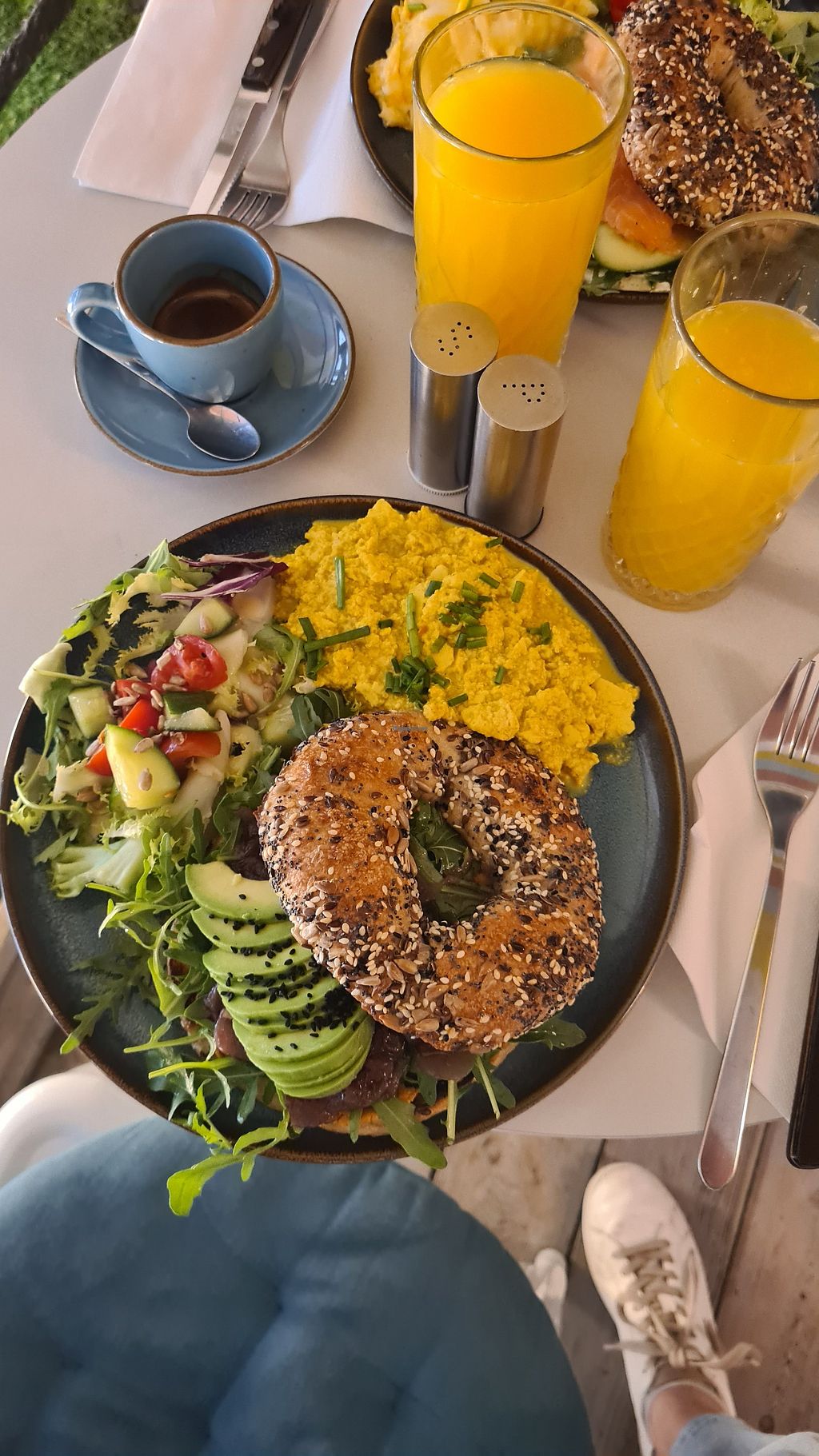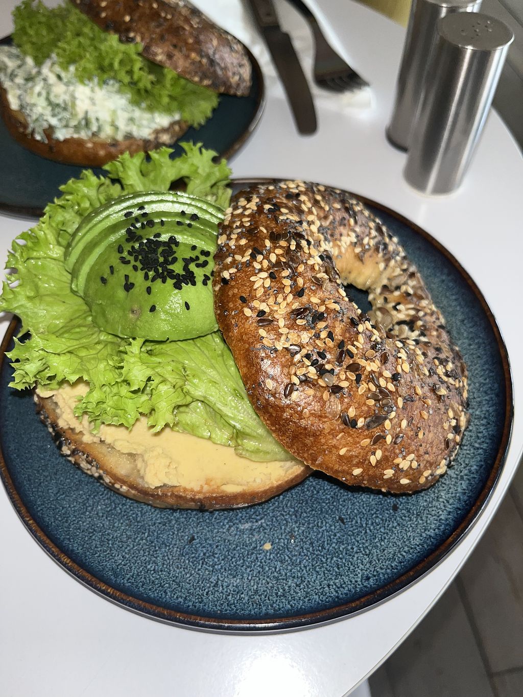 Avo and hummus bagel, matcha with soy milk and cherry and choc cake🙌