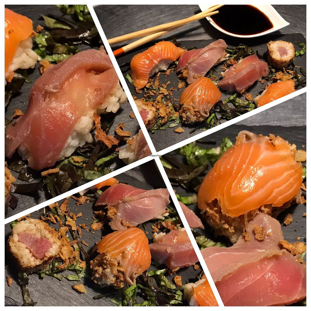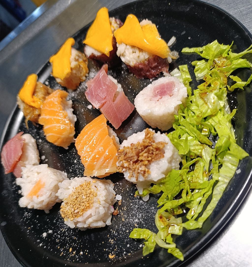 Niguiris de salmón y atún Makis de berenjena asada y cebolla carameliz…