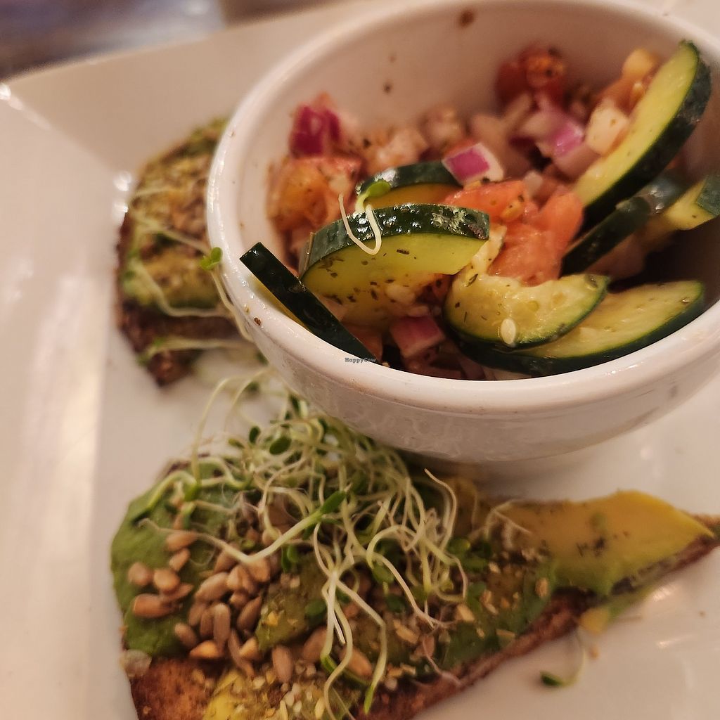 We stopped by for breakfast, and our only option was a tasty avocado toast with cucumber salad. But nothing marked vegan, and no real knowledge from staff. Oat and almond are choices for non dairy milk in your coffee .