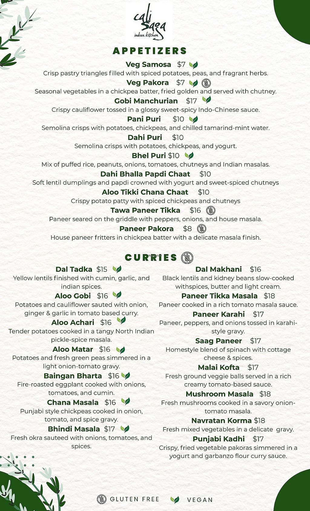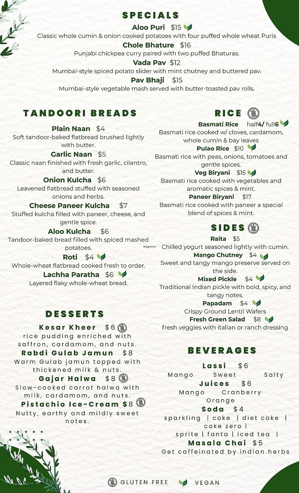 Vegetarian restaurant offering naturally vegan and veganizable dishes like veg samosa (fried pastry with spiced potato filling), veg pakora (vegetables fritters in chickpea batter), gobi manchurian (Indo-Chinese cauliflower dish), aloo gobi (potato-cauliflower curry), and veg biryani (spiced rice with vegetables). Open Mon-Sun 11:00am-9:30pm.