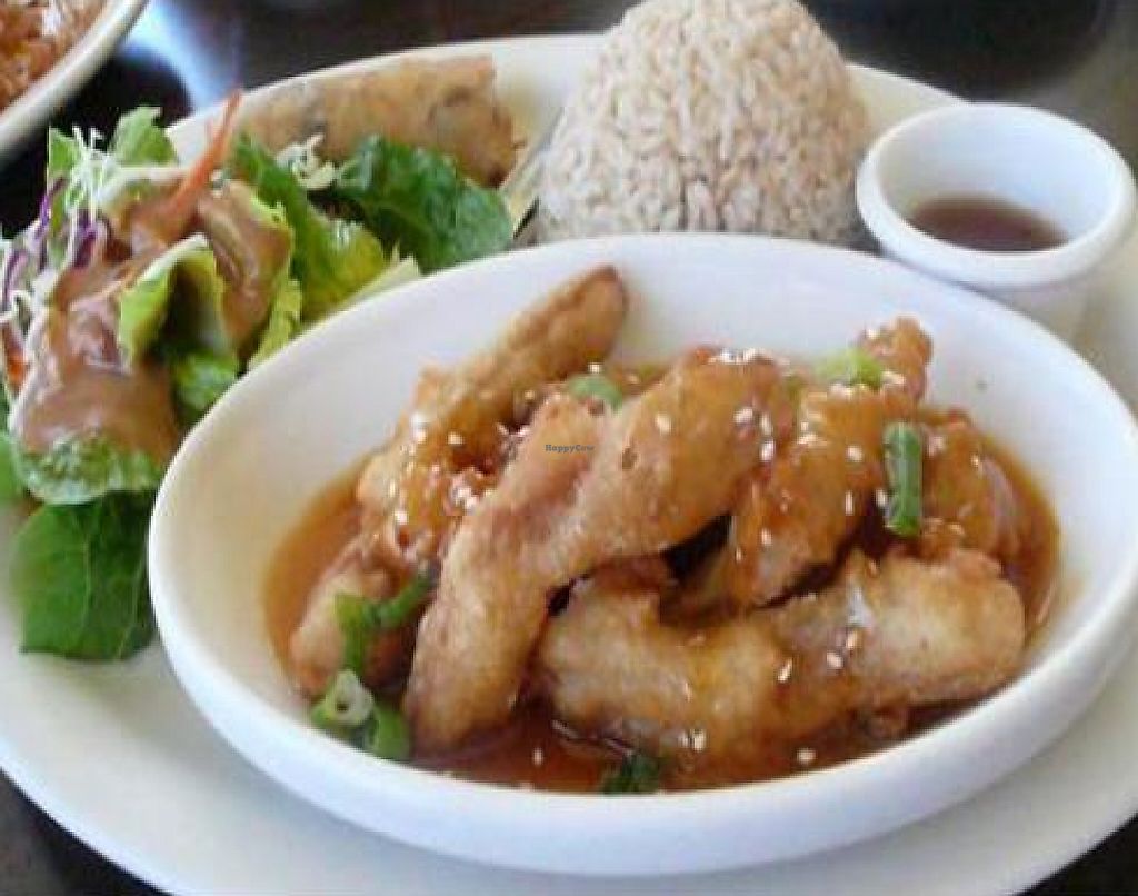 This is a nice vegan although I dont it seems their orange 'chicken' isnt vegan. you can also get your food to go if you dont feel like eating there. i got got the orange 'chicken' (before I found out it wasnt vegan!) it came with rice, salad with some kind of peanut butter dressing, an 'egg roll', soup w/ tofu and seaweed i think my friend called it miso soup...? my friend got the same but instead of orange 'chicken' it was some kind of spicy curry i think. He is not a vegan or vegetarian and he thought everything was great. The 'chicken' was alittle tough to bite, the peanut based salad dressing wasnt bad...just tasted different, and the tofu in the soup was alittle rubbery? I would definitely go back and try more of their food. The staff was also great. When I looked at the menu I had no idea what to order because i didnt really know what would be good or not and the lady that was working their helped me out and told me what was popular and everything that comes with what you order. I dont know how much everything cost because I didnt pay =P